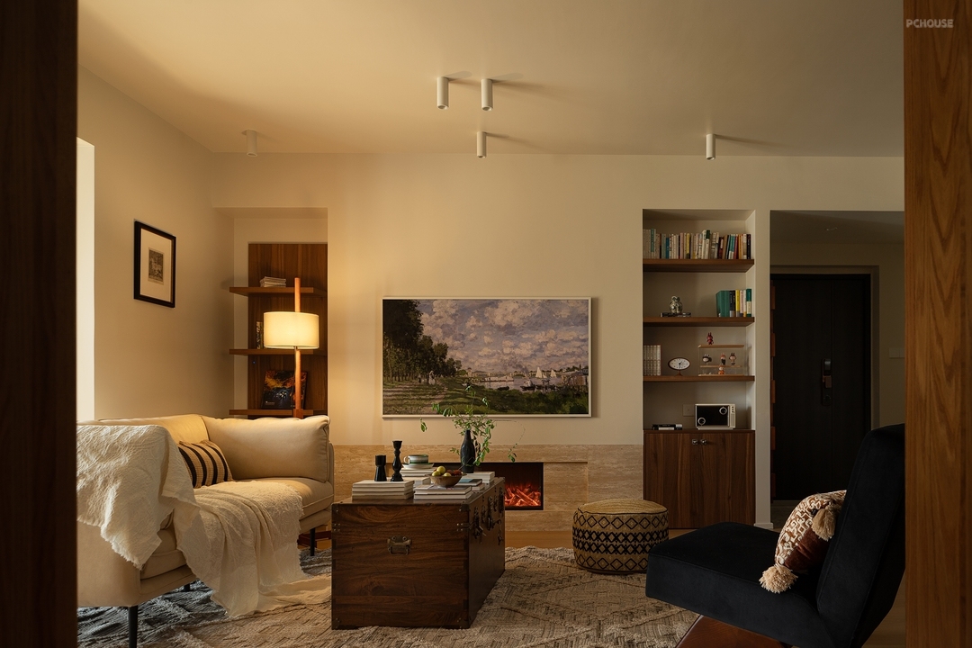 客厅里,壁炉中跳跃的火苗驱散了寒意,心中暖意融融。身体伴随着回春丹的音乐轻轻摇晃。年代感收纳箱静静伫立,似在低诉往昔岁月。