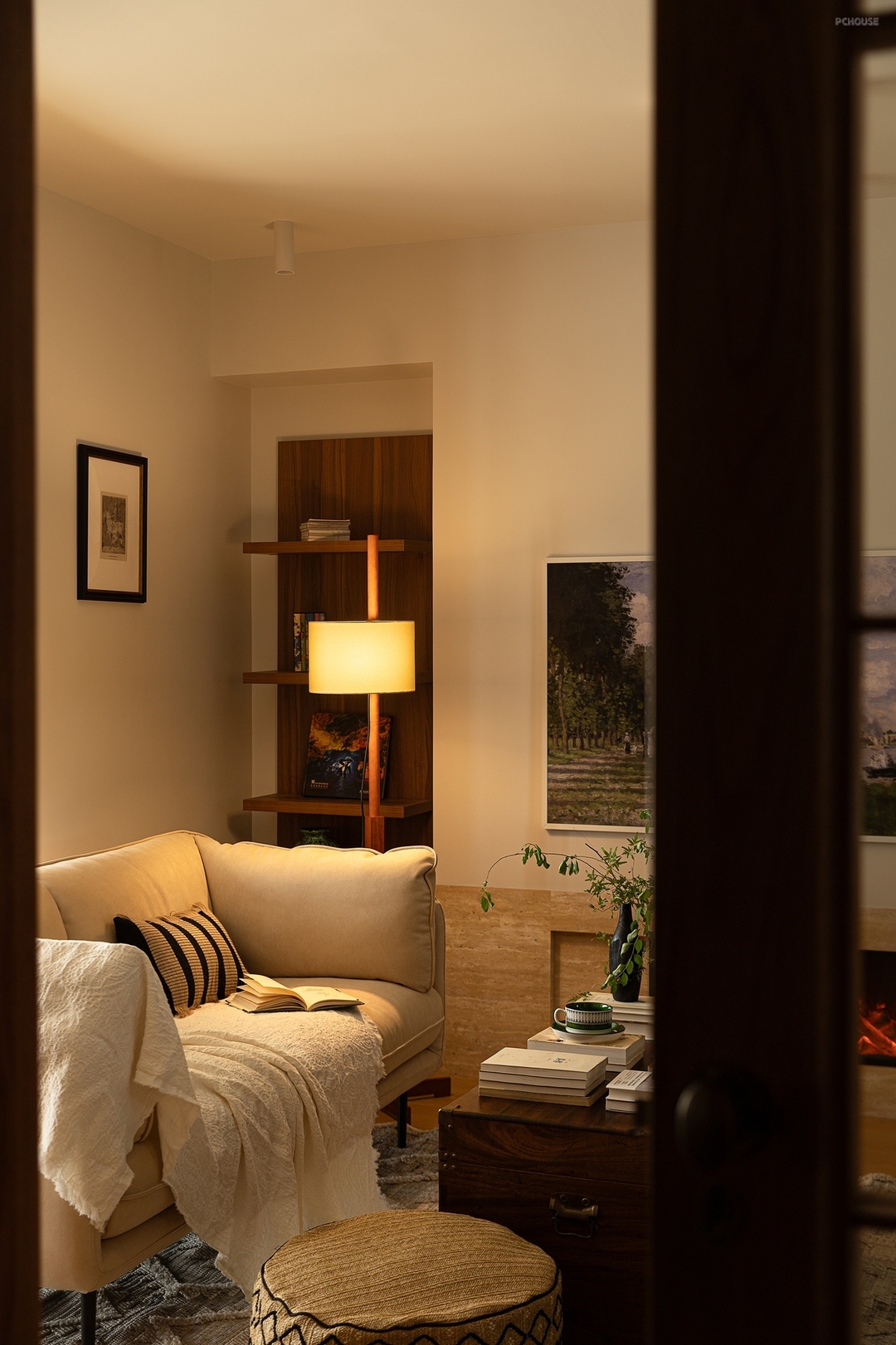 沙发旁金属链条与装饰画相映成趣,下方书架满是智慧的沉淀,复古小灯于书柜悠然静立,暖光摇曳,晕染出一方温馨而文艺的小天地。