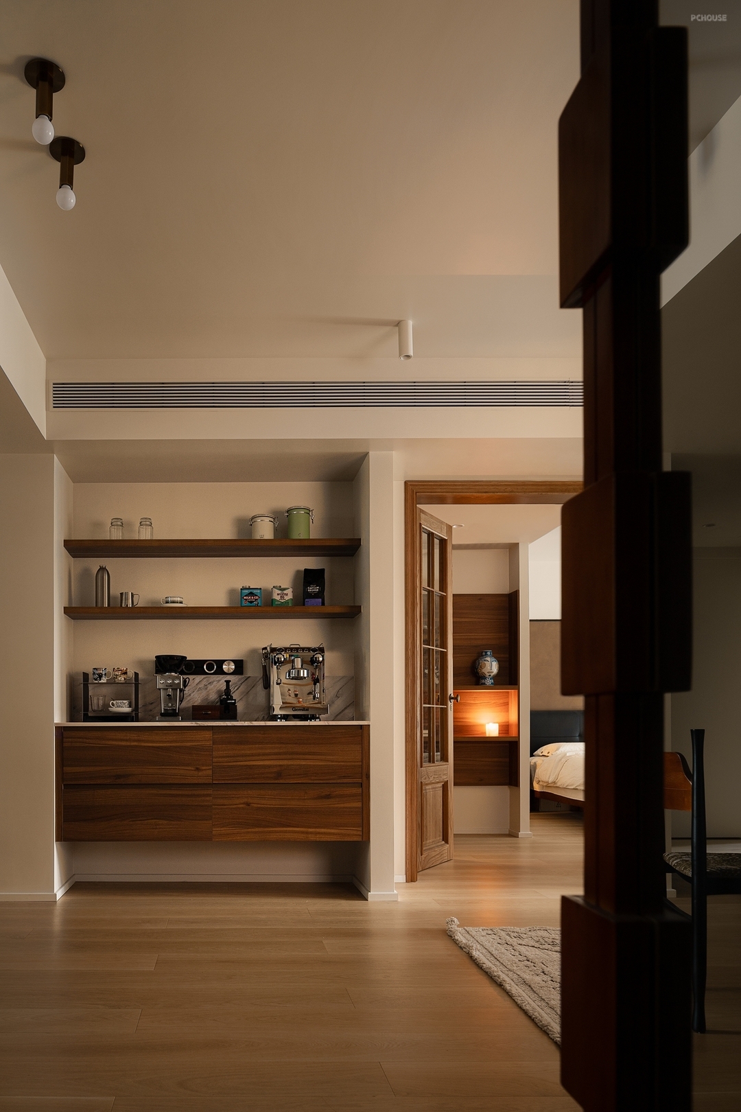 餐厅空间胡桃木与暖白色墙面相互交织,沉稳优雅风格协奏出空间的独特韵律。
