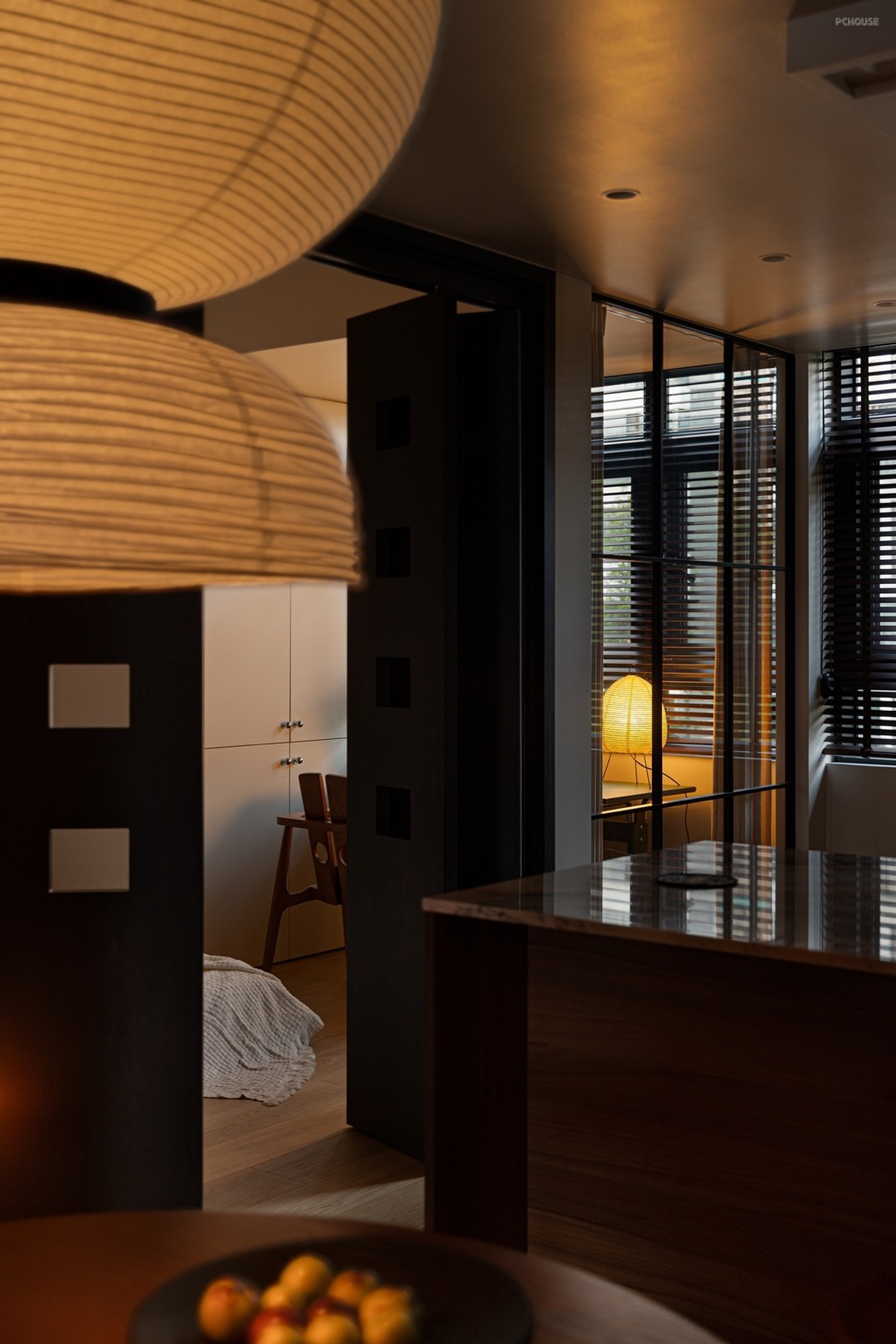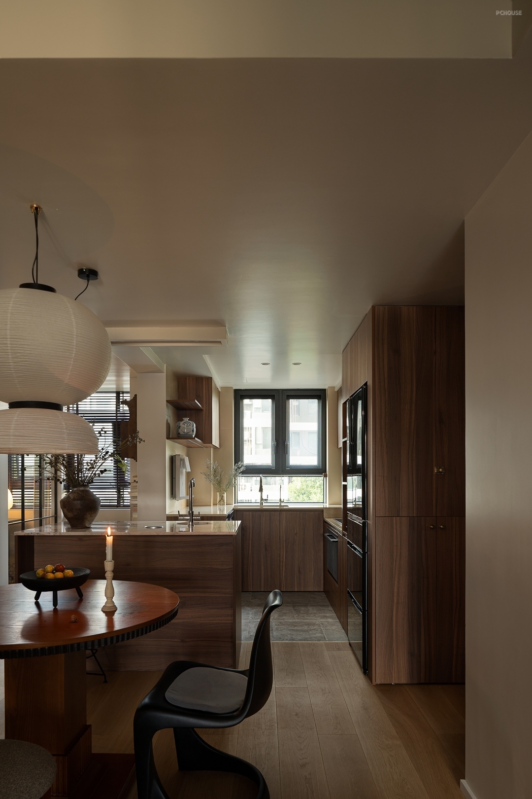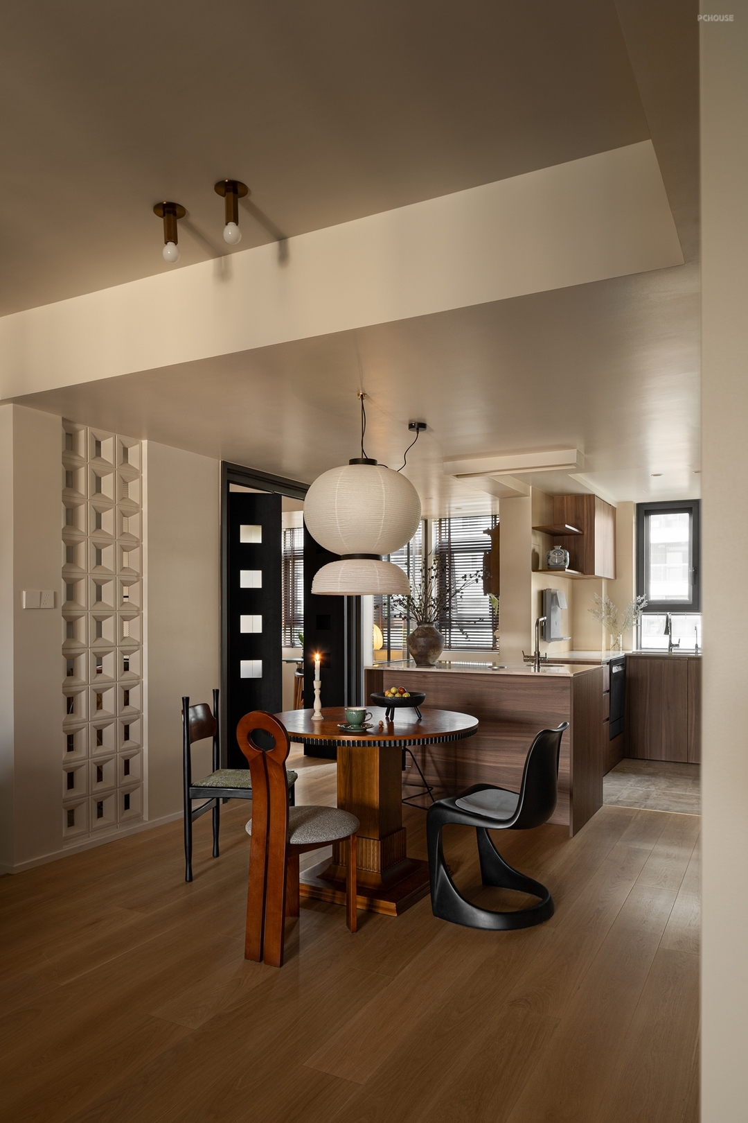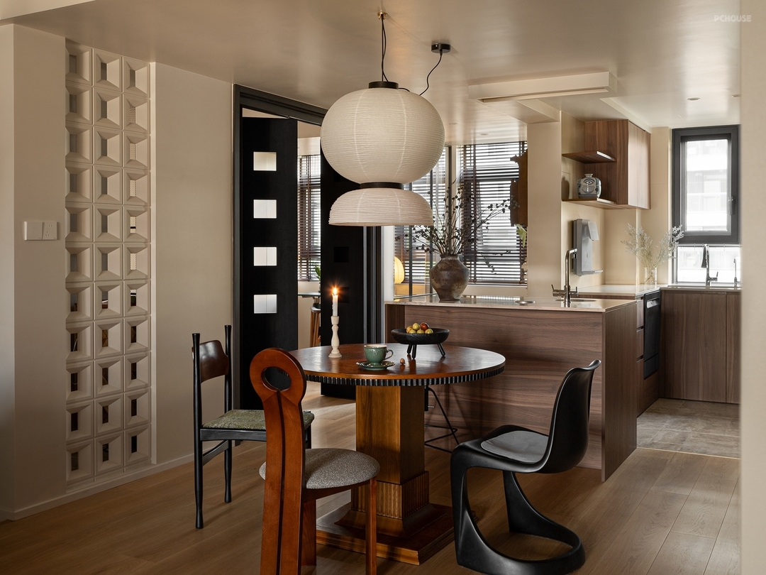 长方形岛台与圆形桌面相映成趣,四把不同造型的椅子彰显设计巧思,野口勇吊灯洒落着暖光,共构优雅用餐空间。