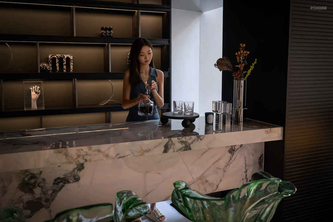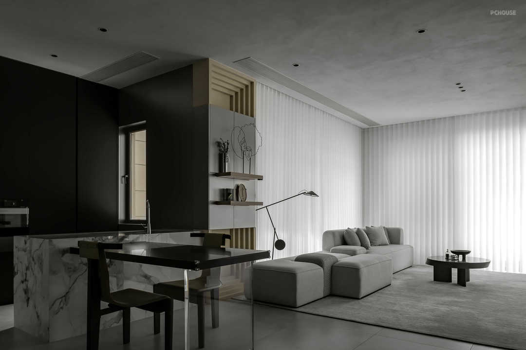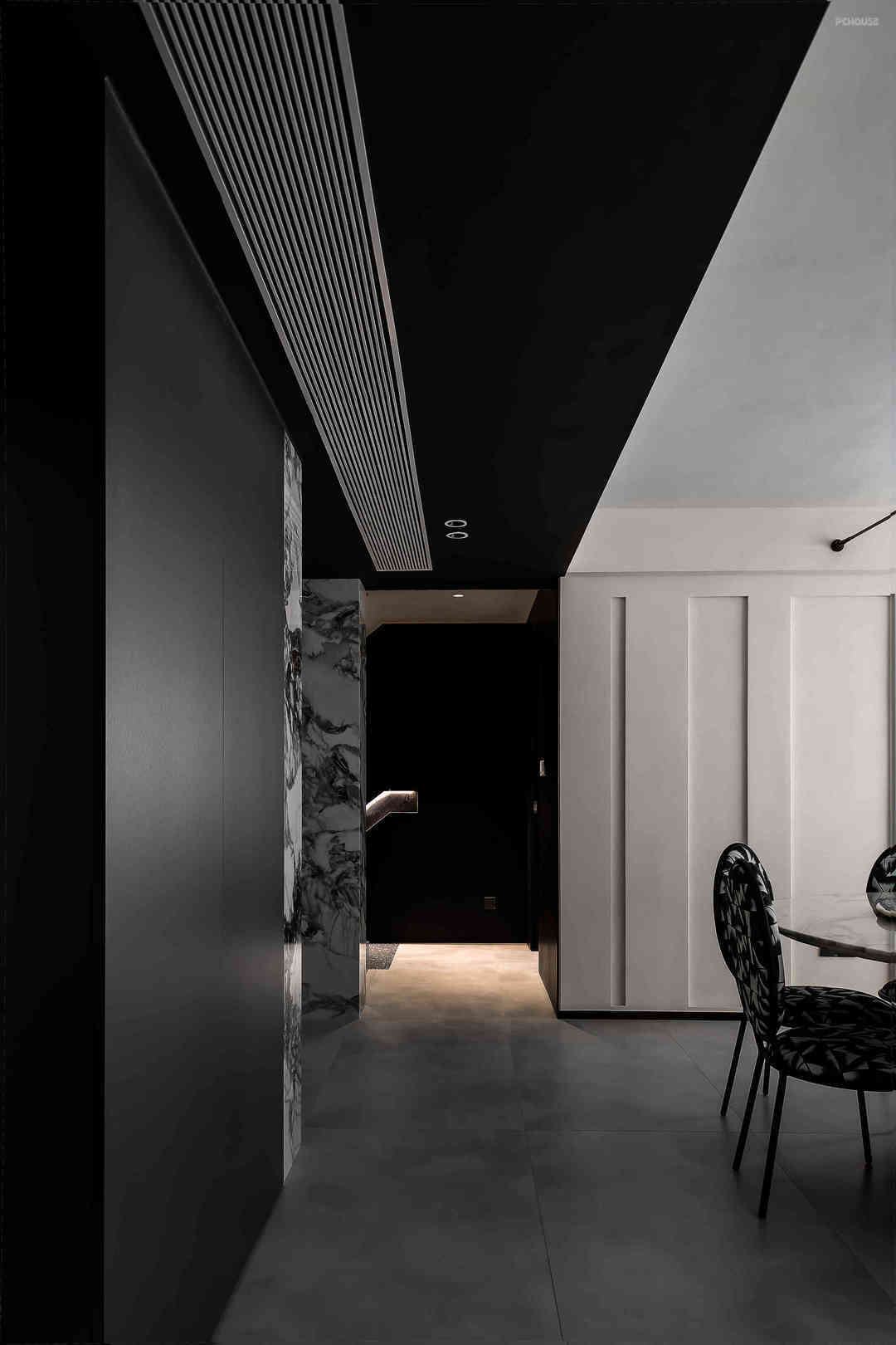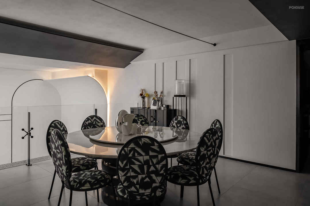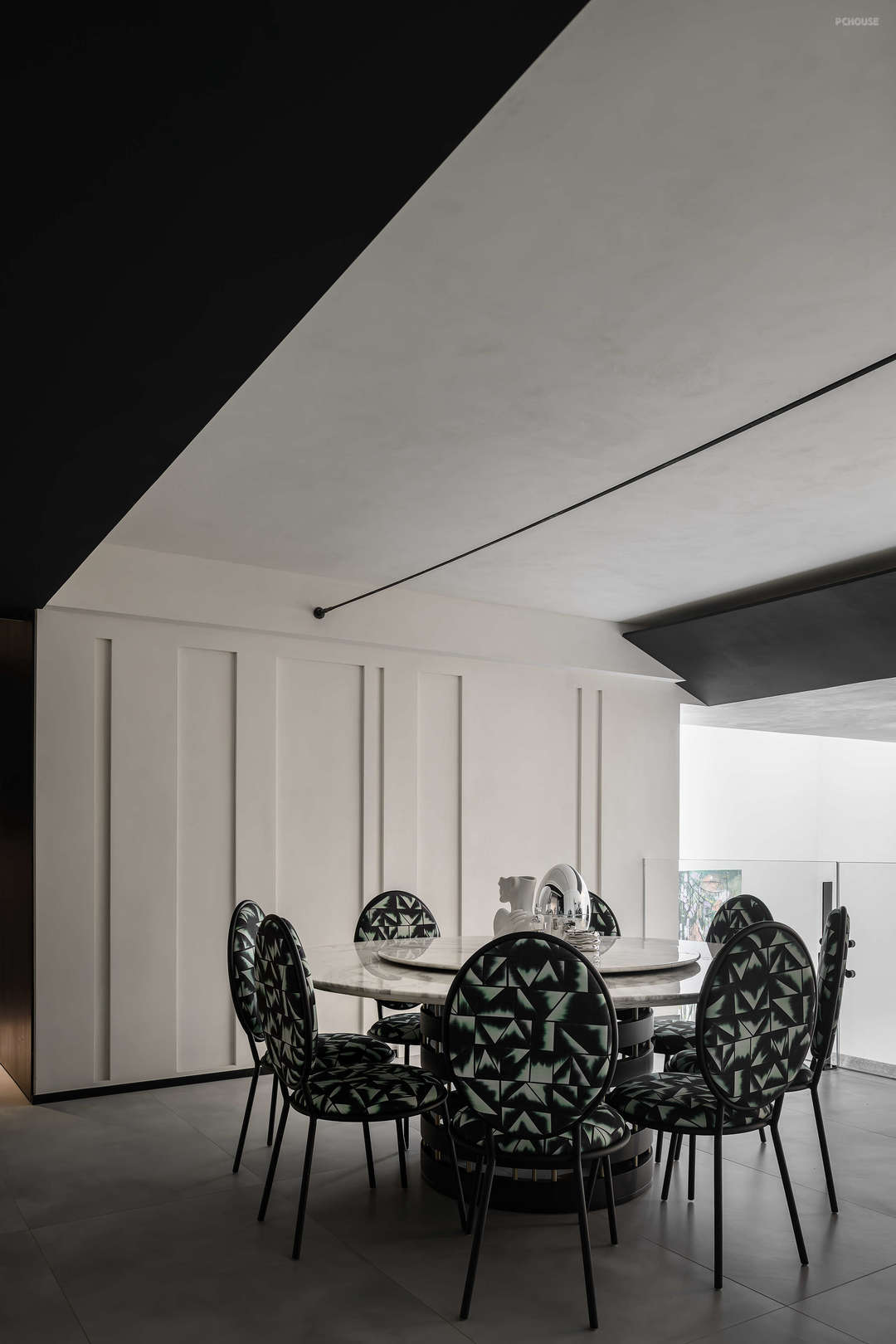 餐厅餐桌中加入翠冷色调,黑白相融,不是一种单纯的递进,而是一种颜色复合的存在形式,再给人一种冷峻,但在精神上传递家的高级感和丰富感。
