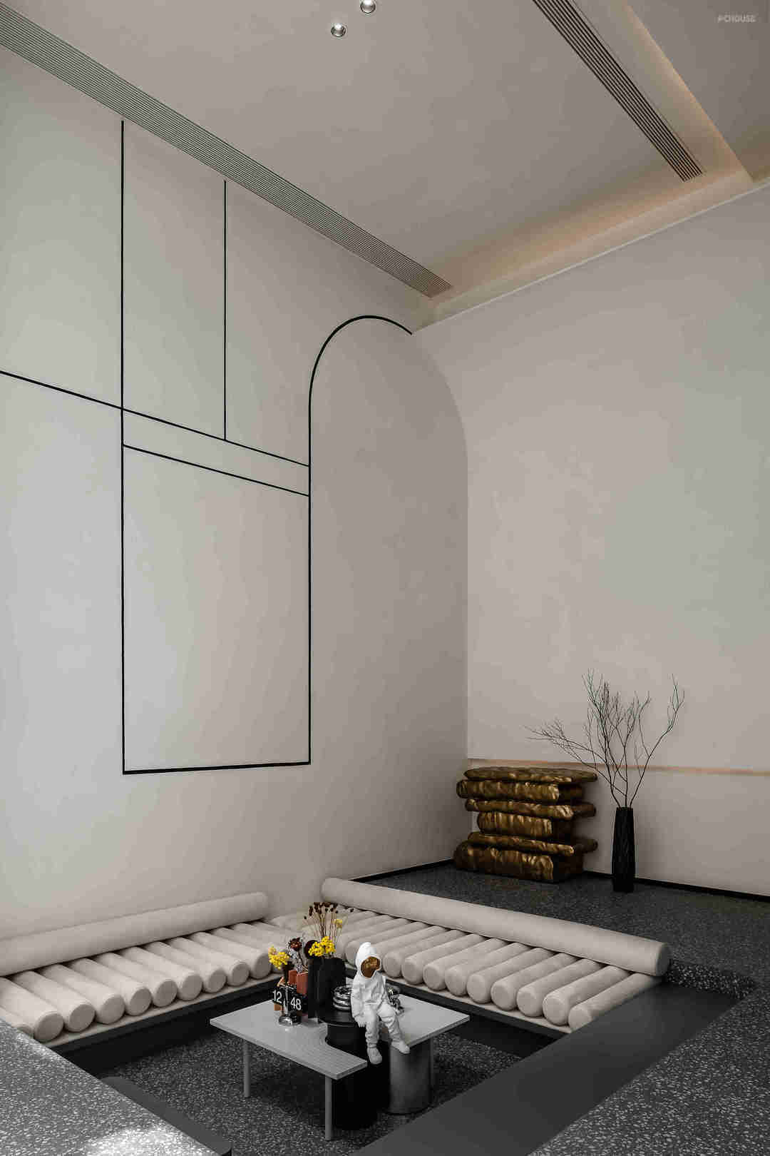 沉降式的会客厅设计,色彩上由白色做主色, 以金色和绿色做点缀,设计结构上,以立体维 度的转变作为设计思路,三维的弧面给人一种无限可能的感觉。 二维则是随着线条出现的展示架,一维是线条 交织的墙面,由三维到一维二维的空间变化,使空间更有穿透力的向外界传递情感。