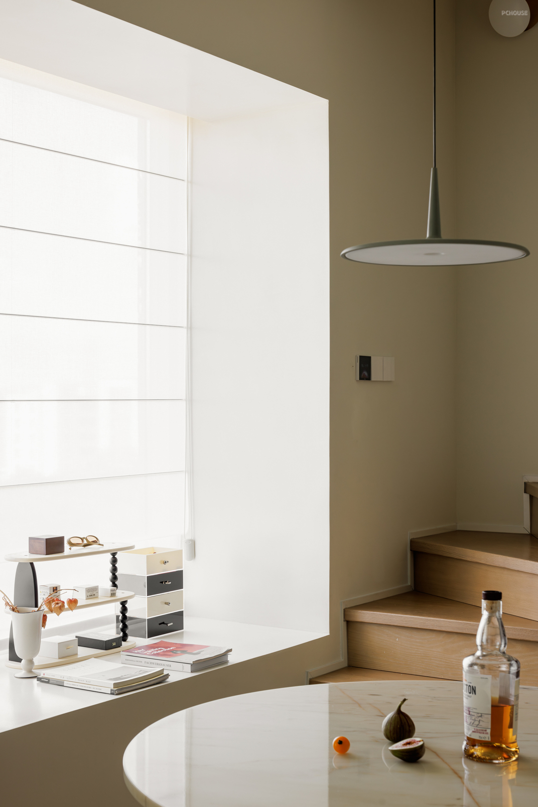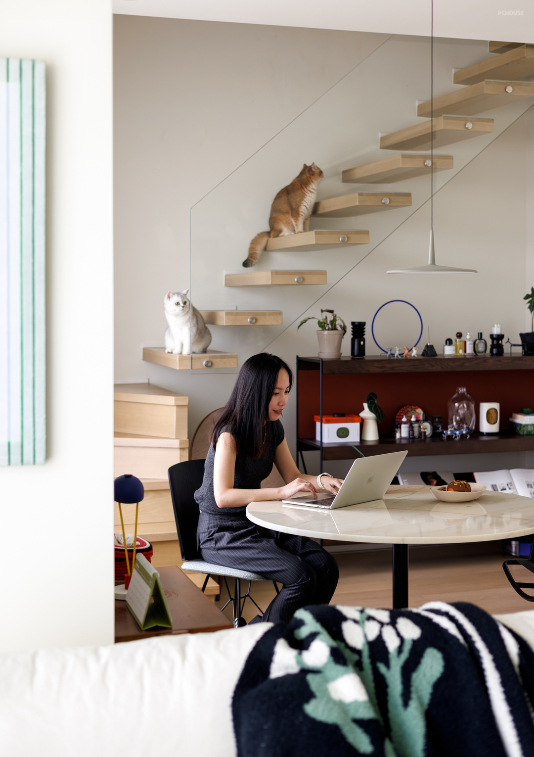 以圆桌为中心的餐厅,在日常中变成了李太太居家办公时的专属,相较于二楼书房的沉浸氛围,这里更适合午后喝一杯香醇的咖啡,带着放松的心情打开电脑。