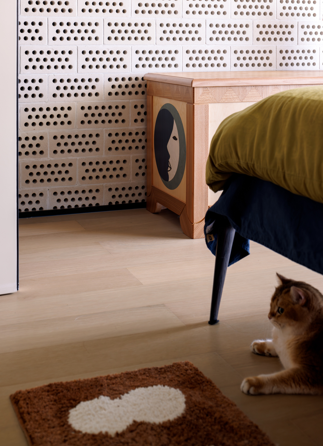 将工装设计常见的波点砖与木格栅用来营造卧室的包裹感,收获了令人惊喜的效果。