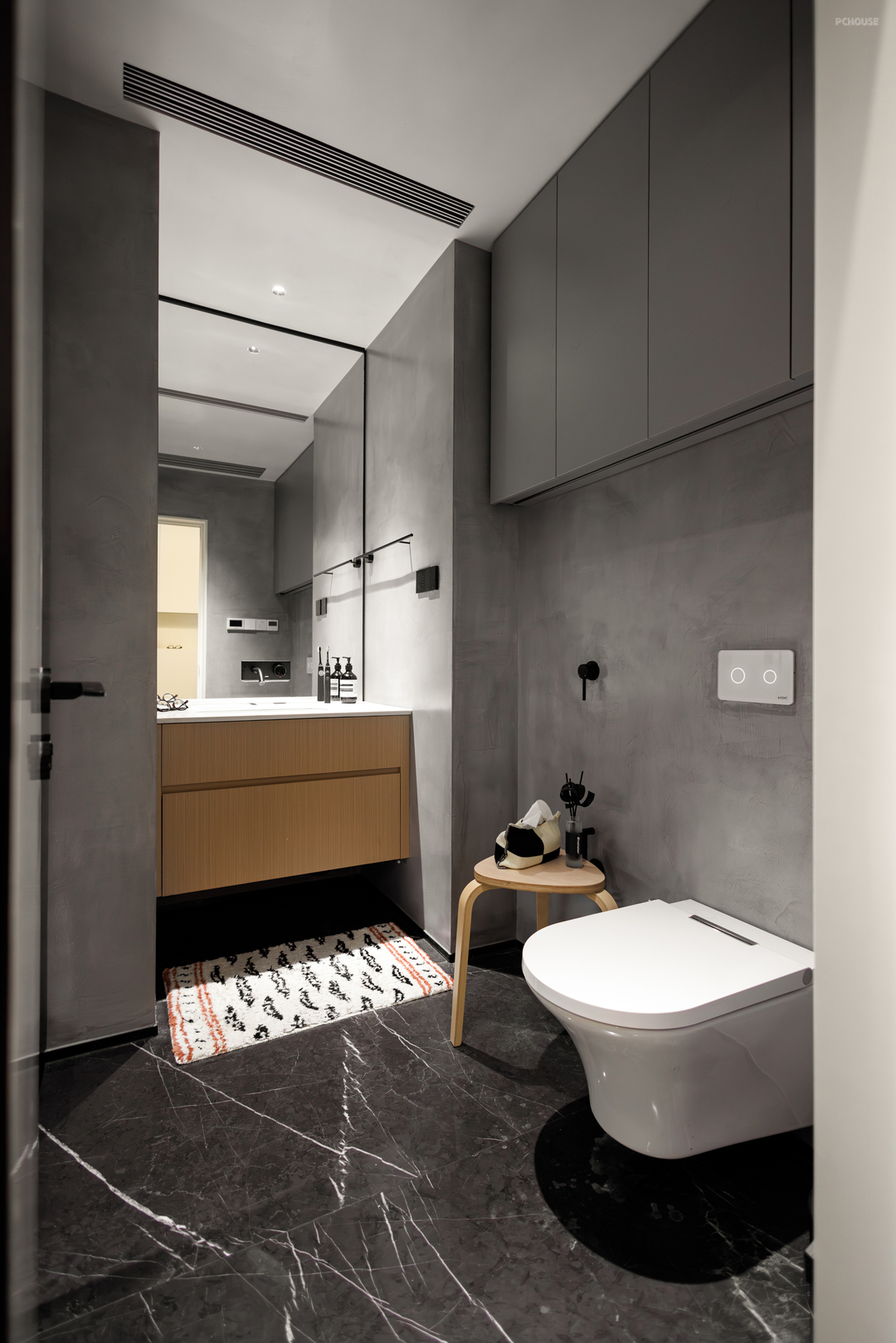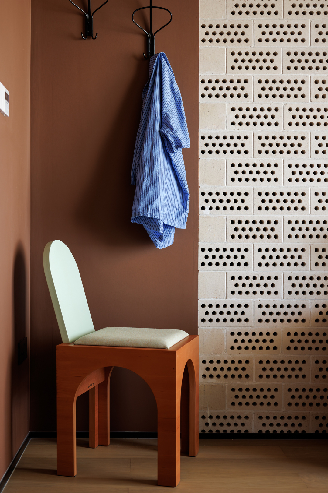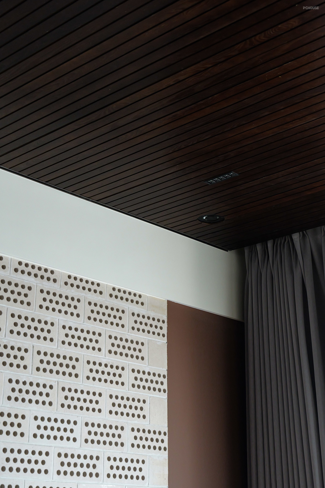 二楼的卧室只专注于睡眠本身,低饱和度的棕色营造了更加松弛的氛围,屋主用“很酷”来形容吊顶与墙面的材质,这里也是她最满意的空间之一。