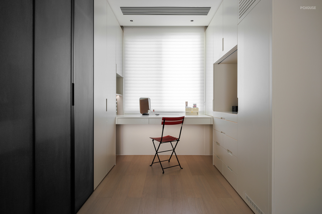 梳妆储物功能与书房结合,充足的储物规划,更衣睡眠不相互打扰。隐藏式冰箱和水吧台,简单的冲泡饮水在这里就能解决。