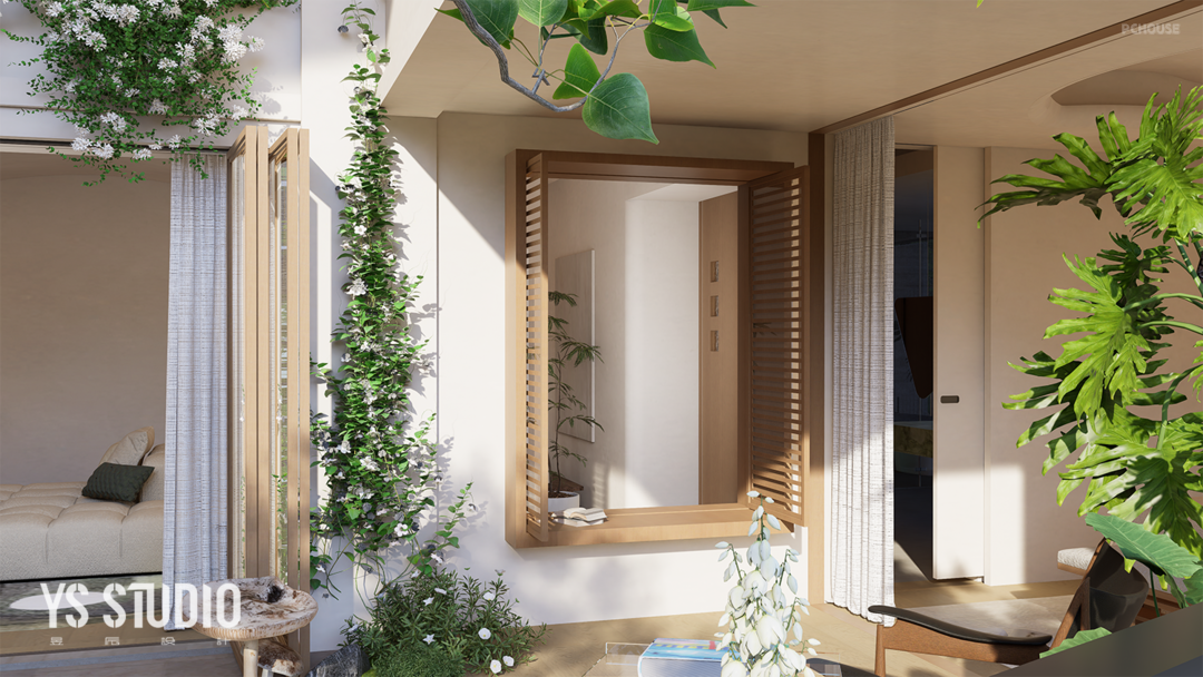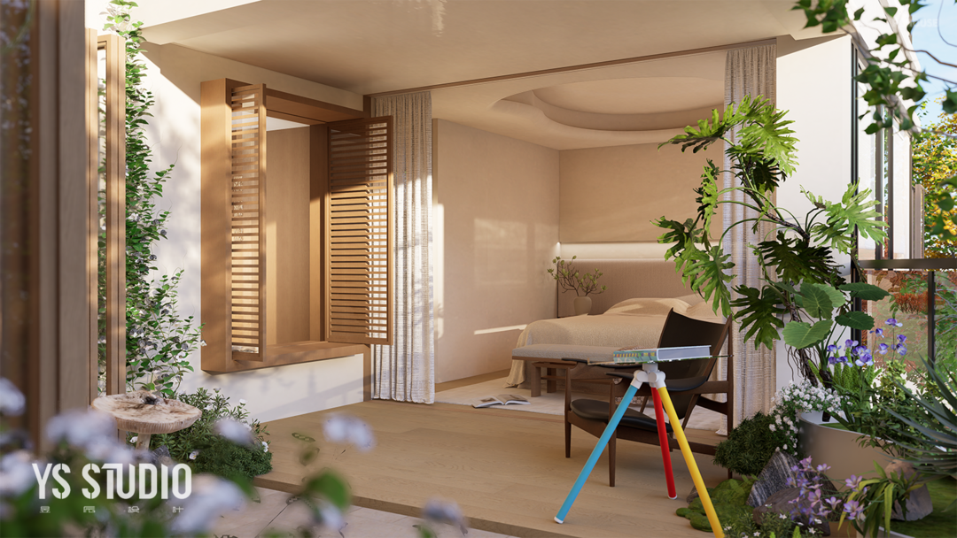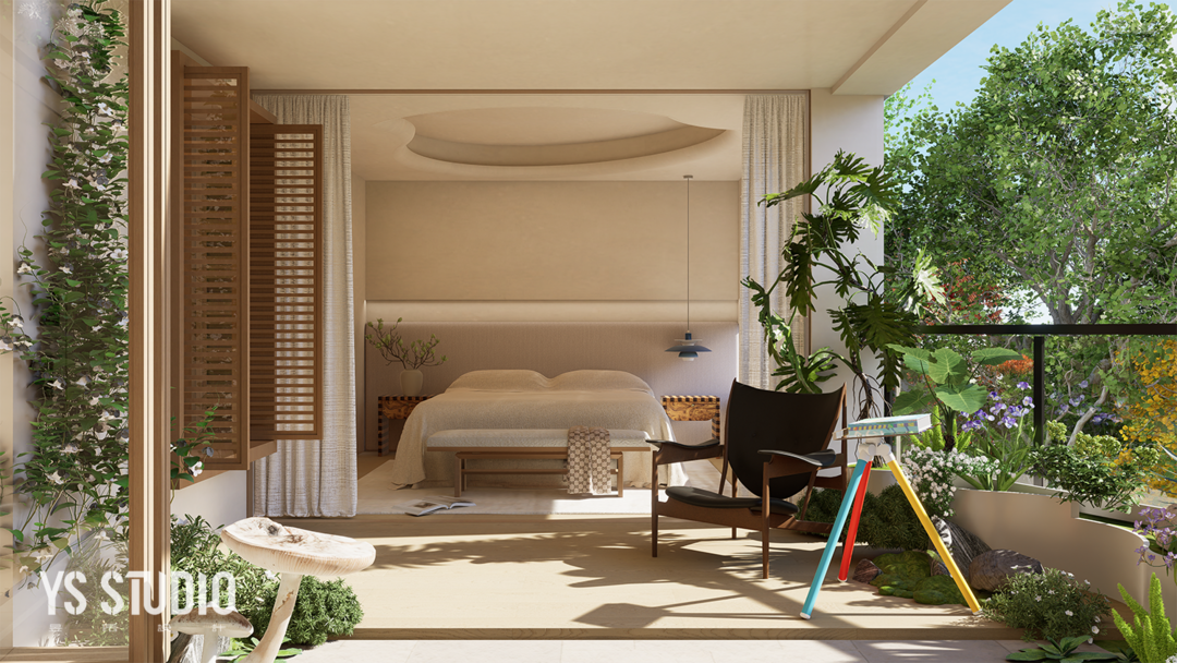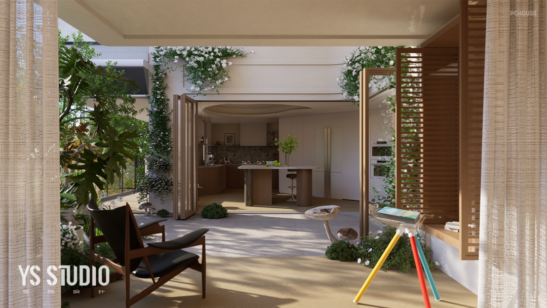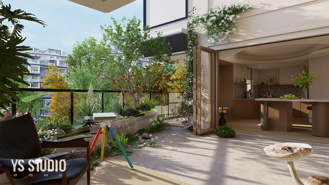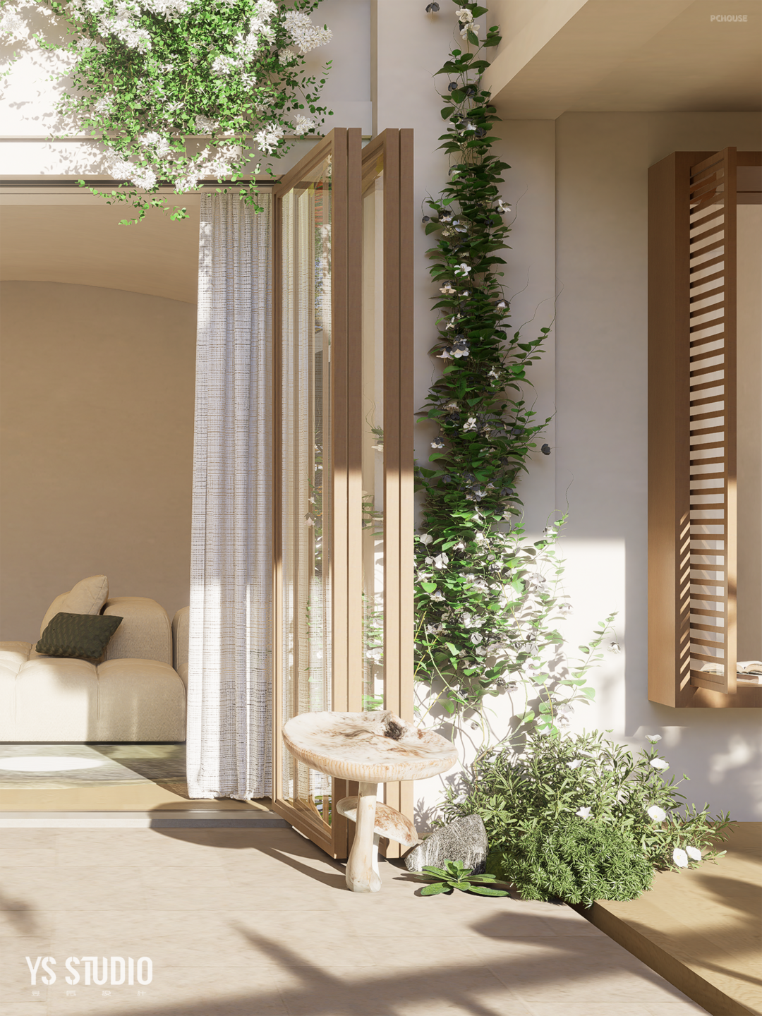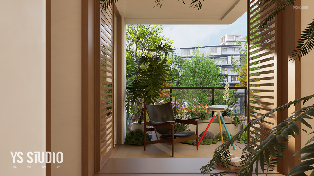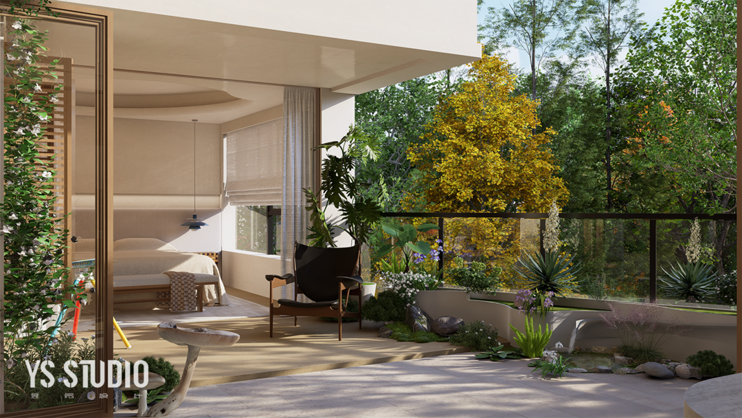 四代住宅,露台成为设计里很重要的部分。我们将这部分空间一分为二,两者通过材质的转换承接了相对不同的功能。与客厅相连的,保留了挑高,承担了花园的属性,最大程度接受阳光的洗礼,引入自然。与卧室相连的部分,我们做了一点木质的挑台,它与窗的关联性更强,让建筑与室内产生了某种更亲密的联系。