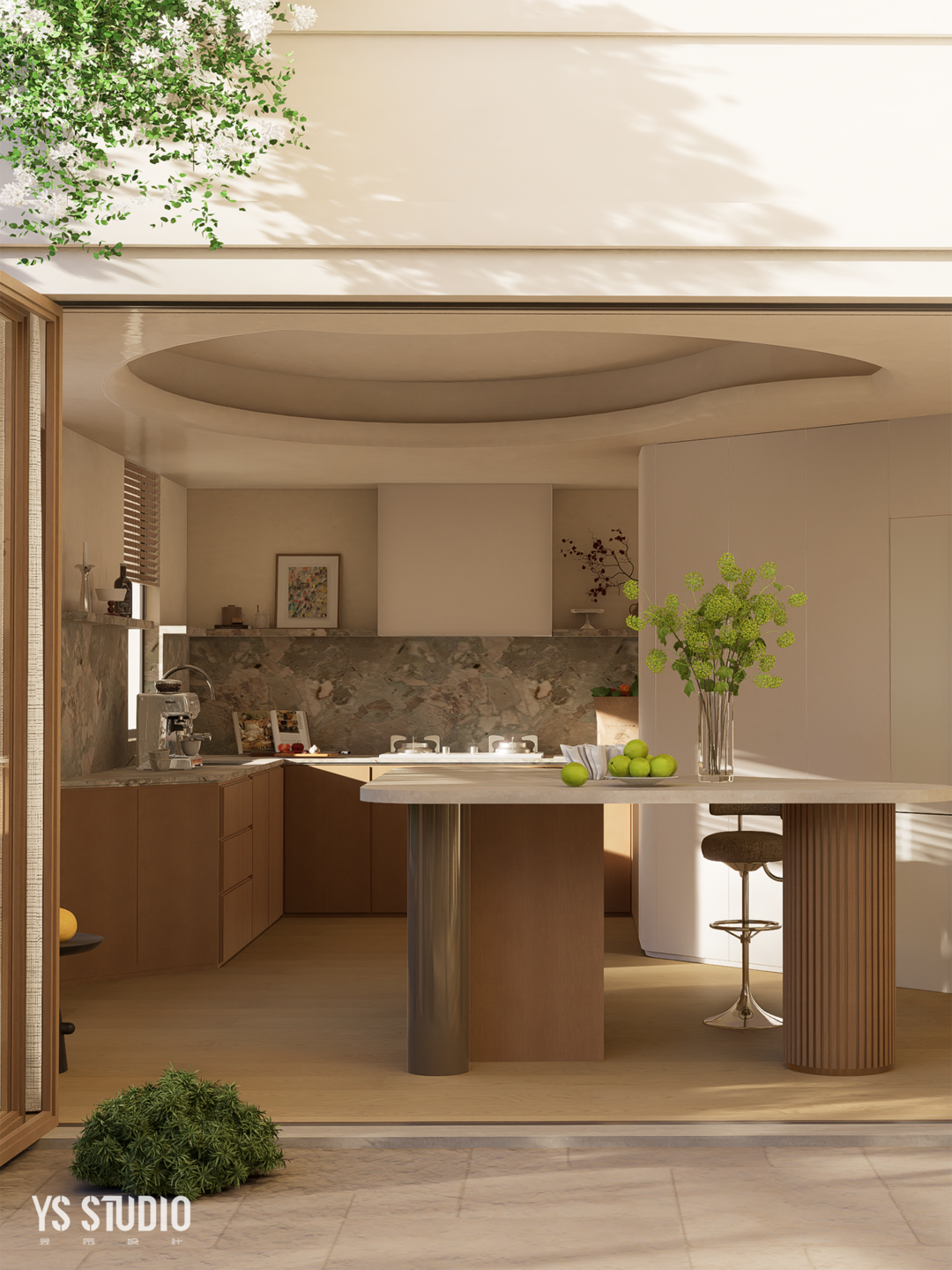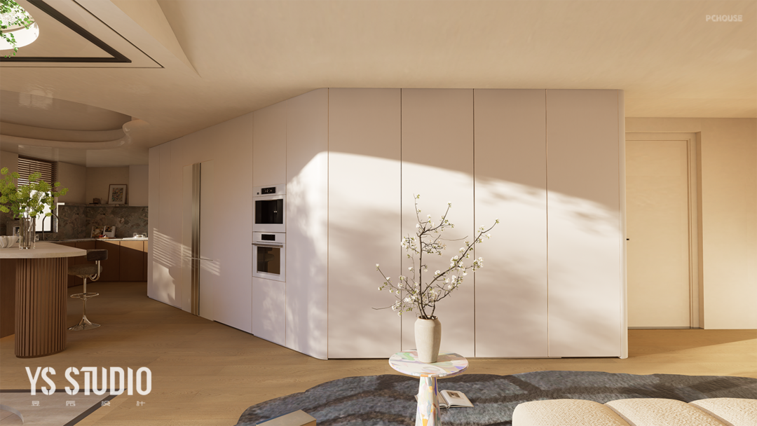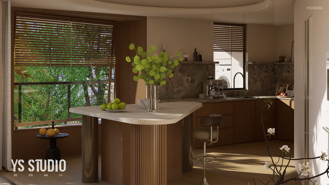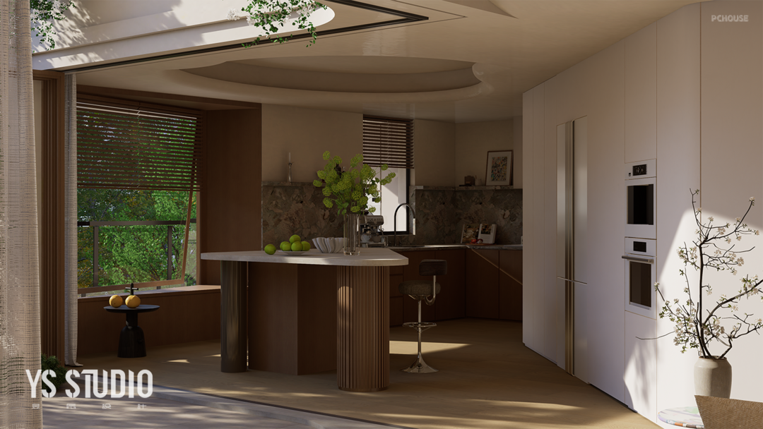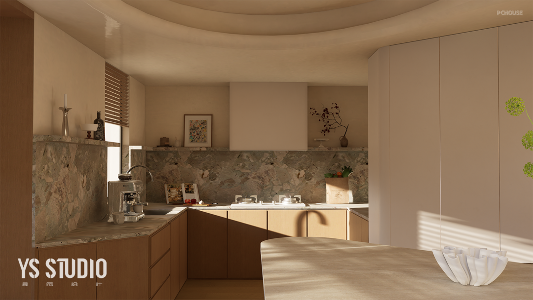 无论是顶面的弧度,还是带着倾斜角度的柜体,空间动线行云流水,由远及近拉伸,厨房区域采用了大理石搭配经典复古的柚木橱柜,做法极简高级,同时与室内其他区域也有着和谐的衔接,更好的让光影的律动进入到室内每一寸肌理,在实用主义和浪漫的生活之间寻找到平衡的切面。