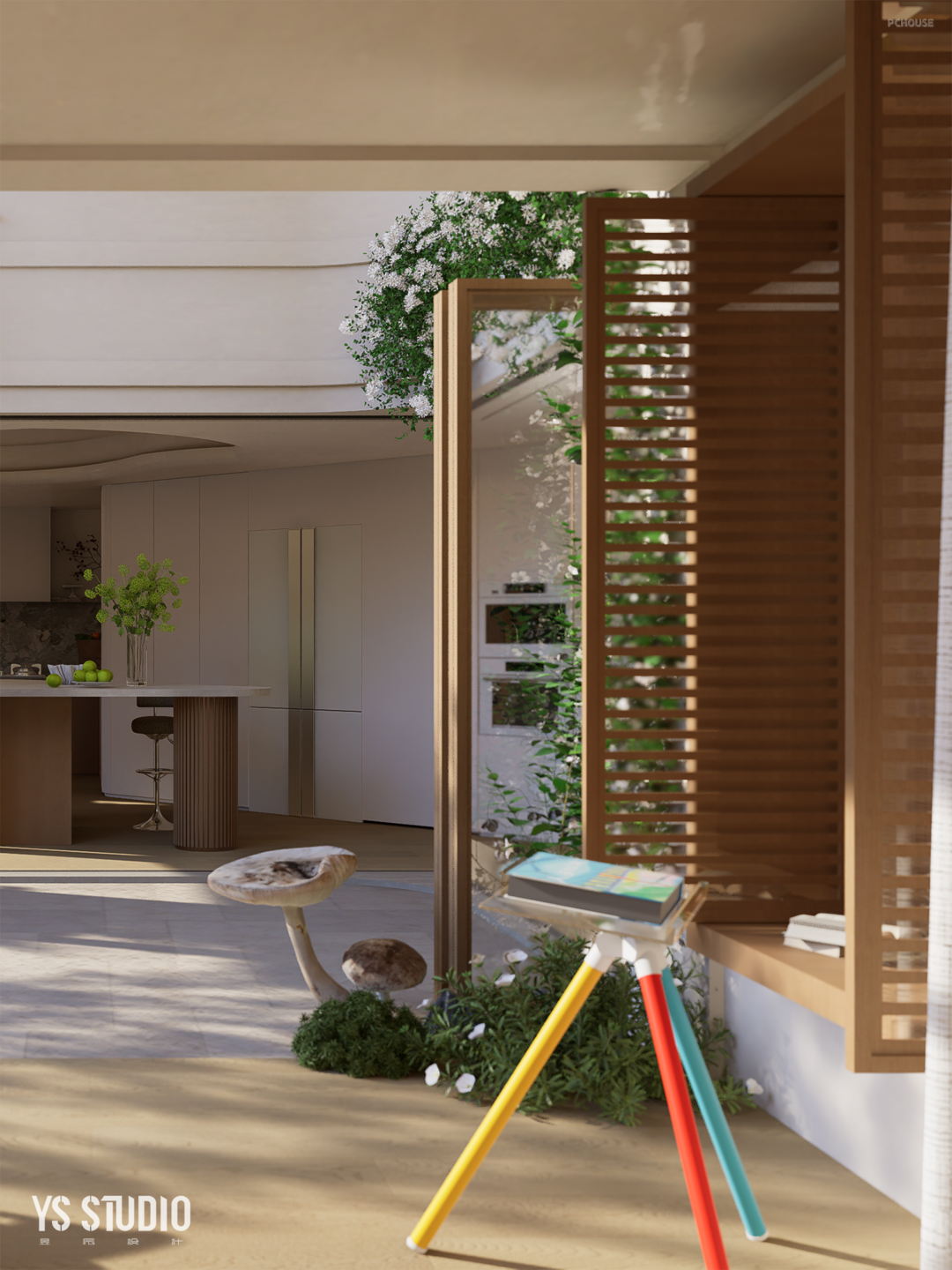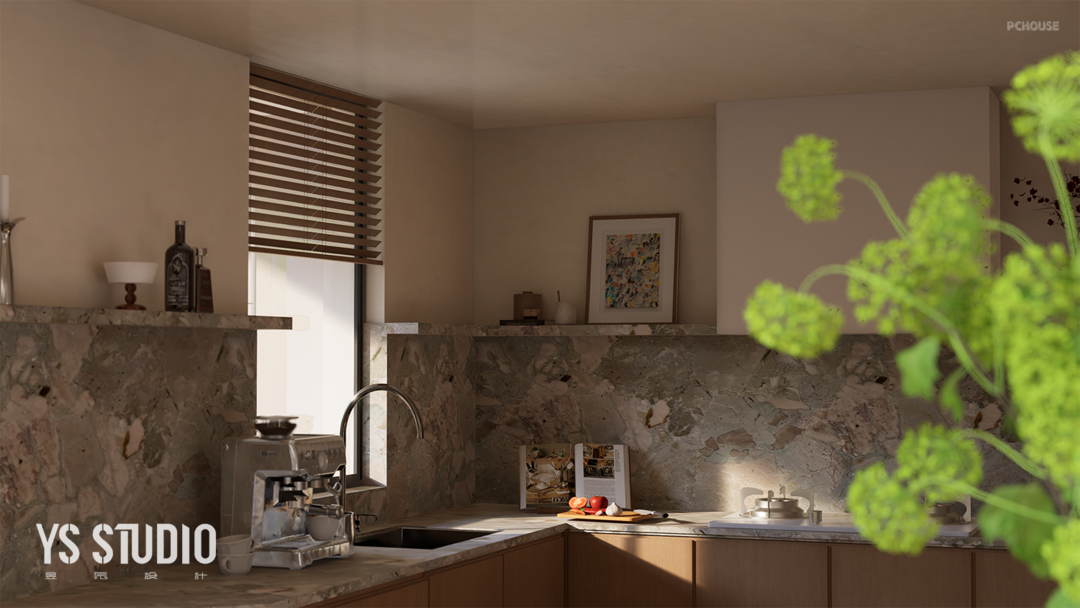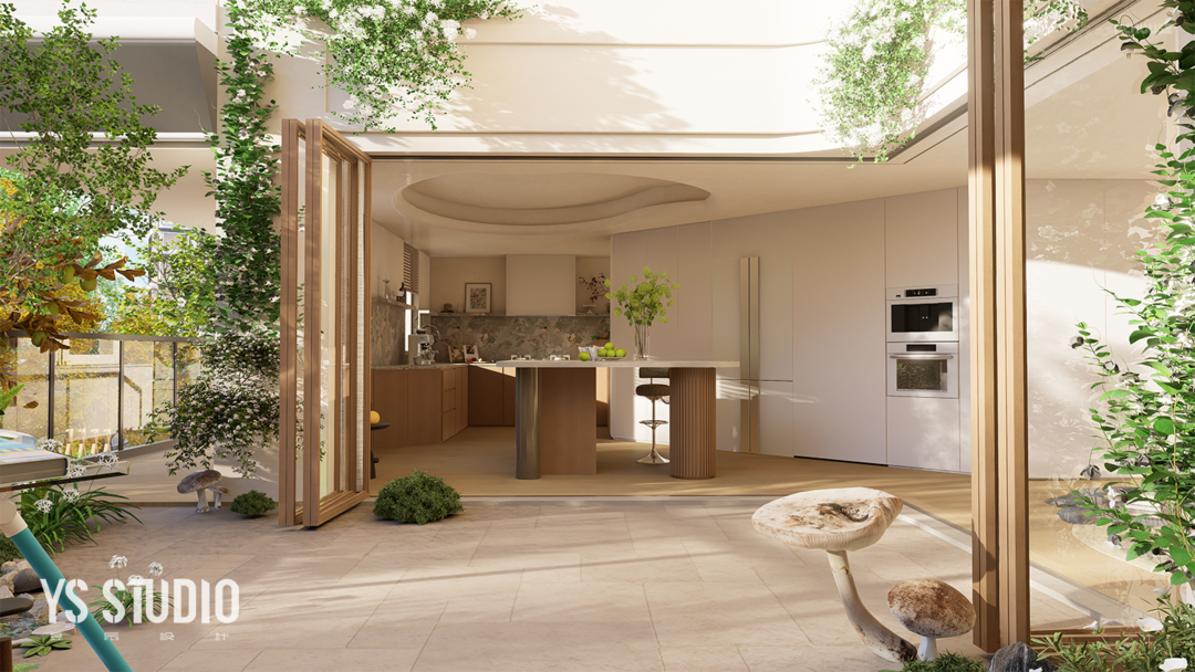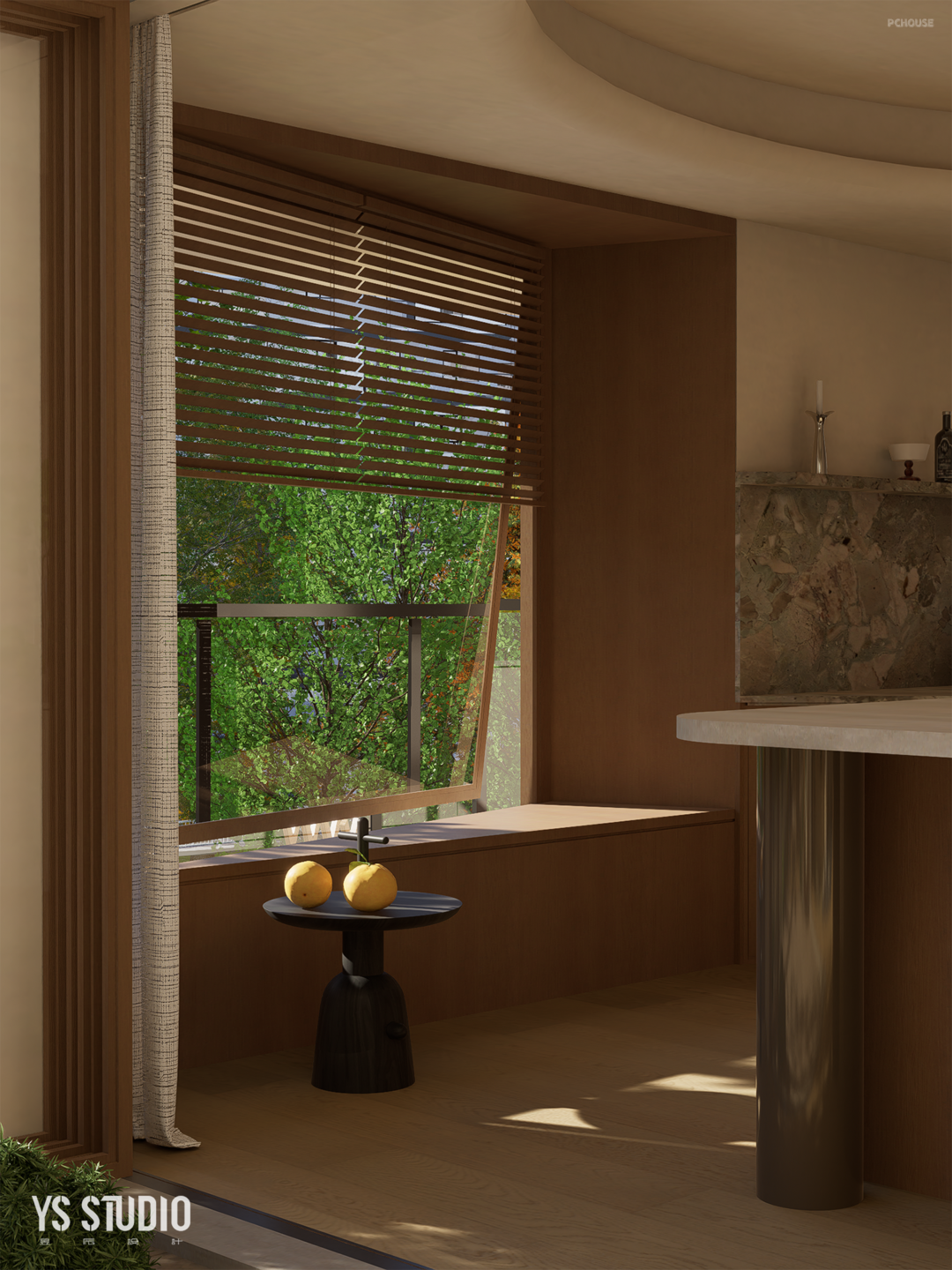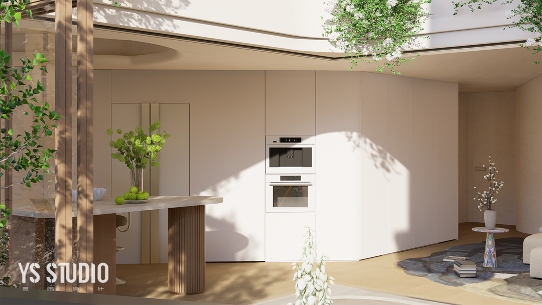 无论是顶面的弧度,还是带着倾斜角度的柜体,空间动线行云流水,由远及近拉伸,厨房区域采用了大理石搭配经典复古的柚木橱柜,做法极简高级,同时与室内其他区域也有着和谐的衔接,更好的让光影的律动进入到室内每一寸肌理,在实用主义和浪漫的生活之间寻找到平衡的切面。
