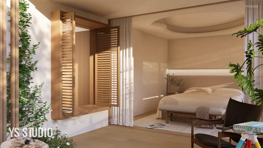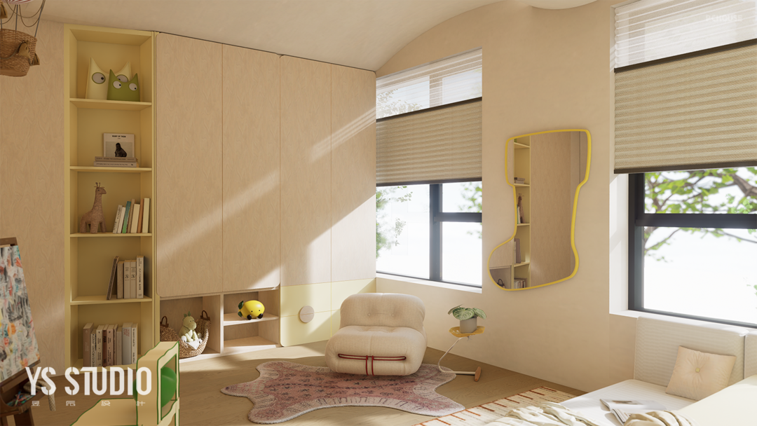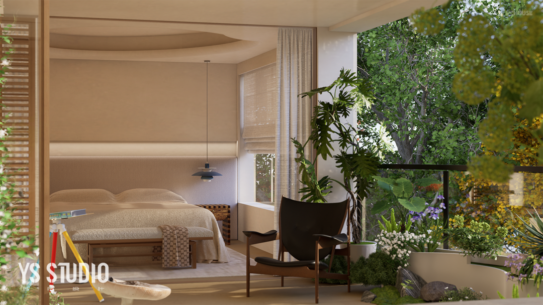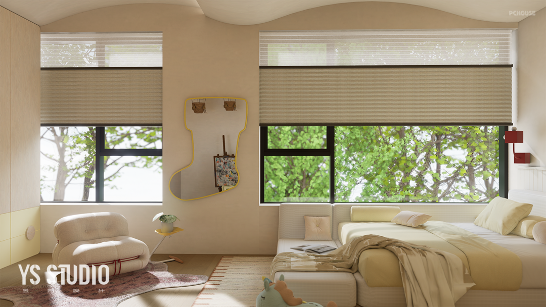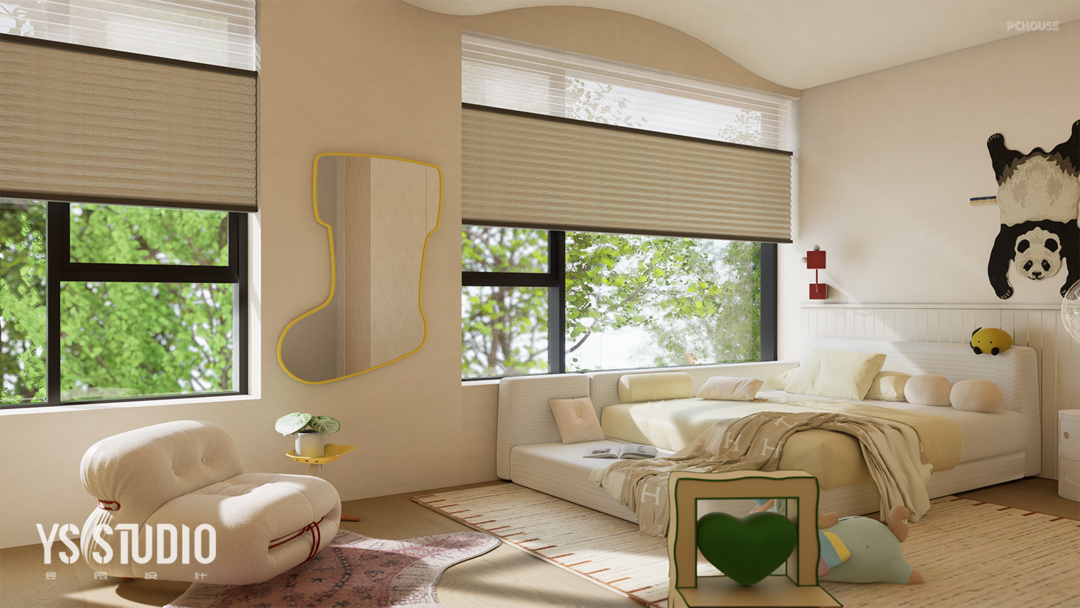 主卧没有复杂的造型,一个好的窗景将景观和光线引入室内,使其成为空间里最好的滤镜,为业主提供更舒适的氛围,舒缓日常的情绪。