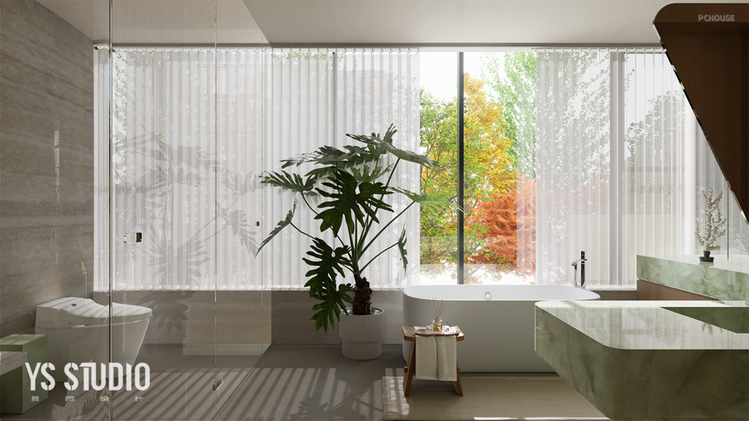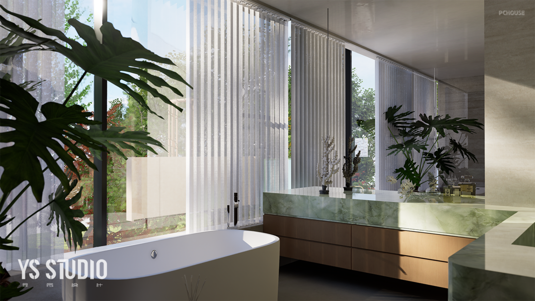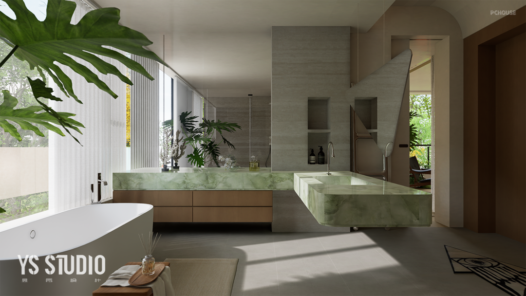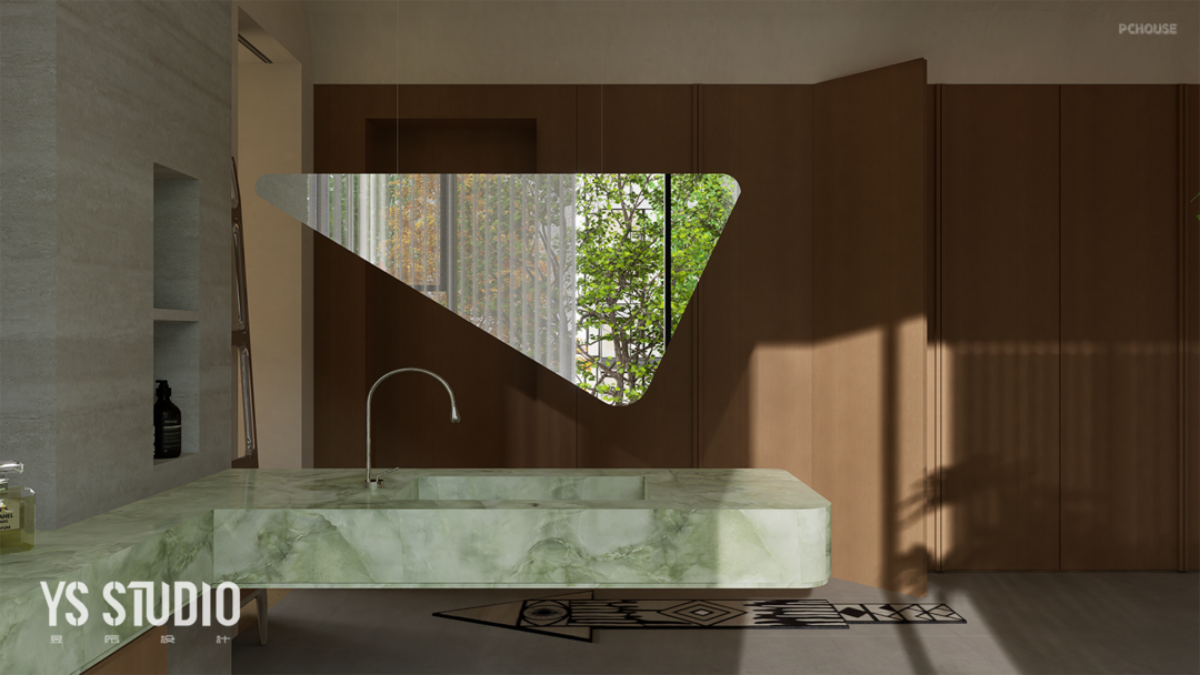 大面积的窗景,使这个本该较为私密性的空间也变得非常通透、敞亮。为了让室内外更具有一体性,我们选用了「青玉」这一材质,与木质元素相结合,片刻的惬意,是独处的浪漫。