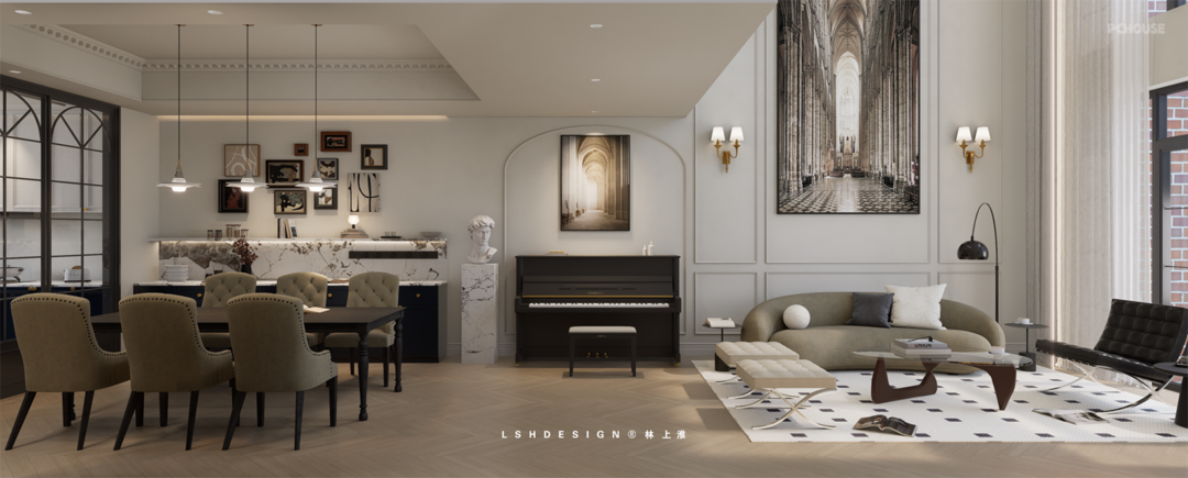 客厅背景融合了古典主义的对称与均衡,钢琴区的弧线又带有浪漫的柔美与细腻,轻盈有质感,餐边柜的错落相框又俏皮的诉说着家得不羁。每一个细节都恰到好处的诉说着不同的故事。