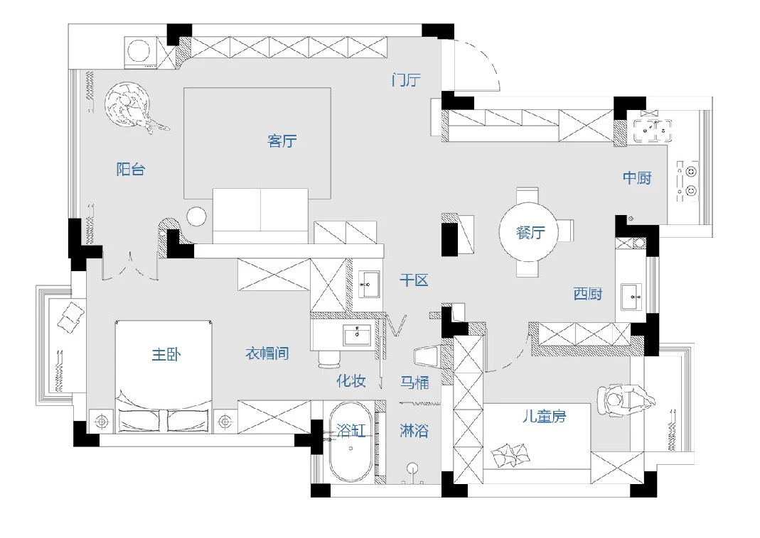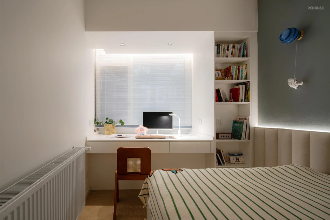 4️⃣ 儿童房基本保留在原本的次卧位置,调整了进入位置;整个空间最重要的改动设计就是卫生间区域,下面我会详细分析。