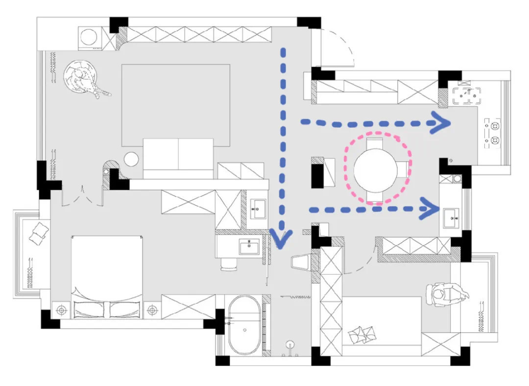 围绕着C位圆桌形式的紫色洄游动线,连接了步入的主动线(蓝色),打开了原厨房的墙体,将餐厅和厨房进入双动线,让人可以围绕着圆桌绕圈圈~