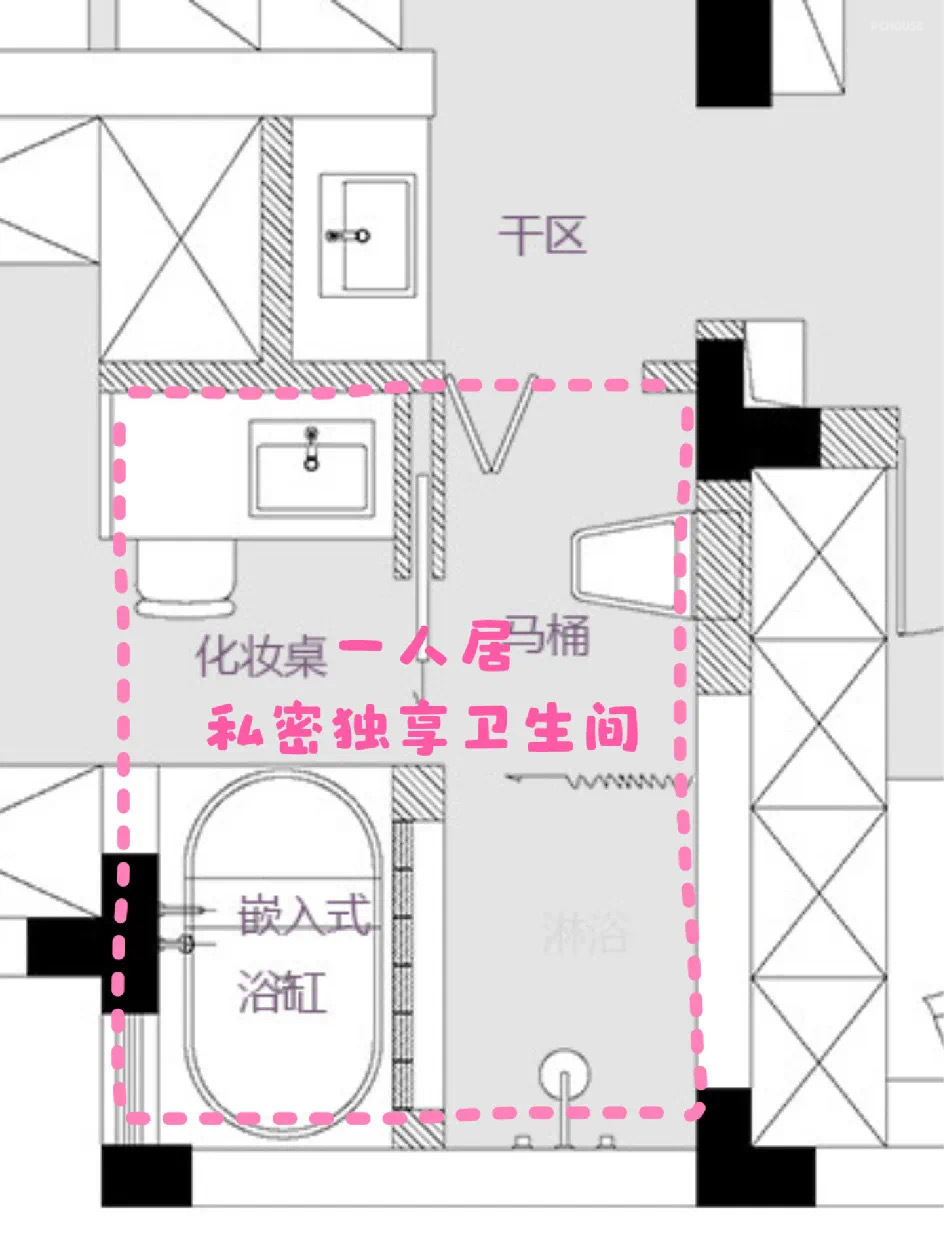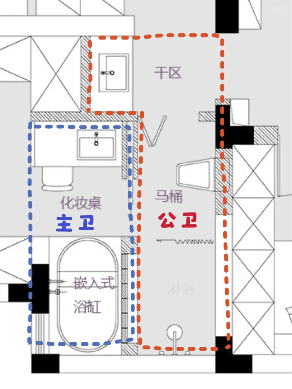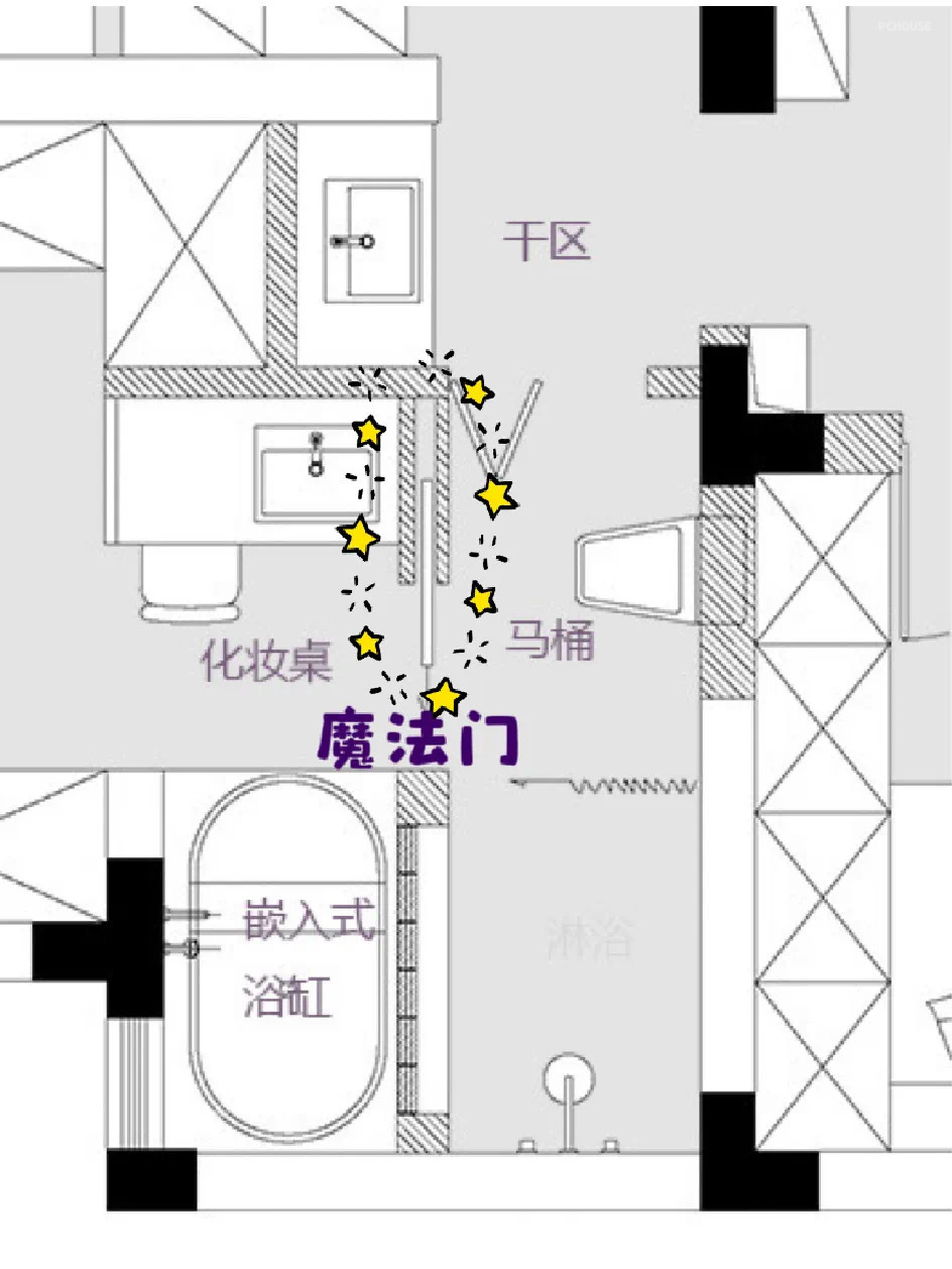 梦琪一人居的状态时,这个魔法门不锁闭,梦琪就可以完全借用正常公卫的所有配置,这个主卫就变成配备马桶、淋浴、浴缸、干区的综合洗浴空间。并且这样设计可以减少,主卧大门开在阳台,晚上起夜需要从阳台绕到公卫的长动线!