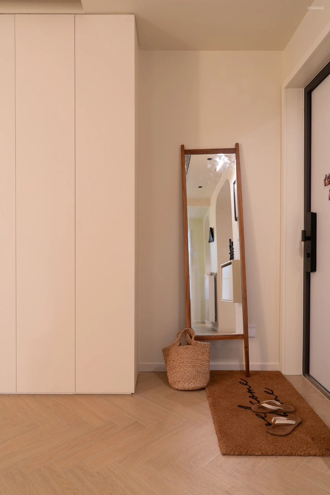 进门侧面是全身镜子,左侧的柜子,对向门厅打开,梦琪也做了很多收纳规划,之后发视频看细节~