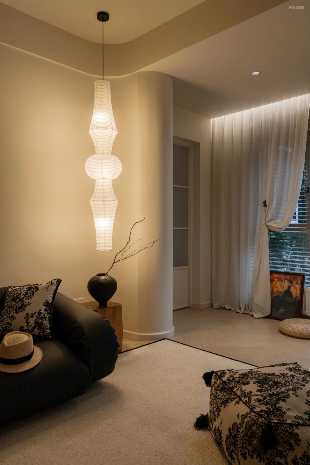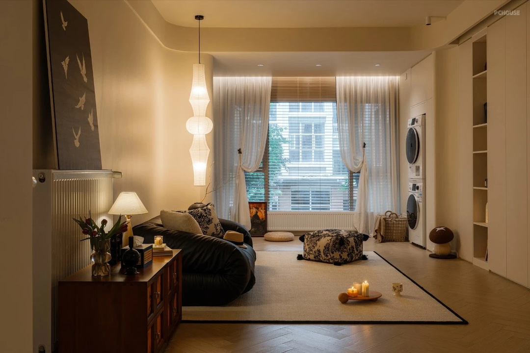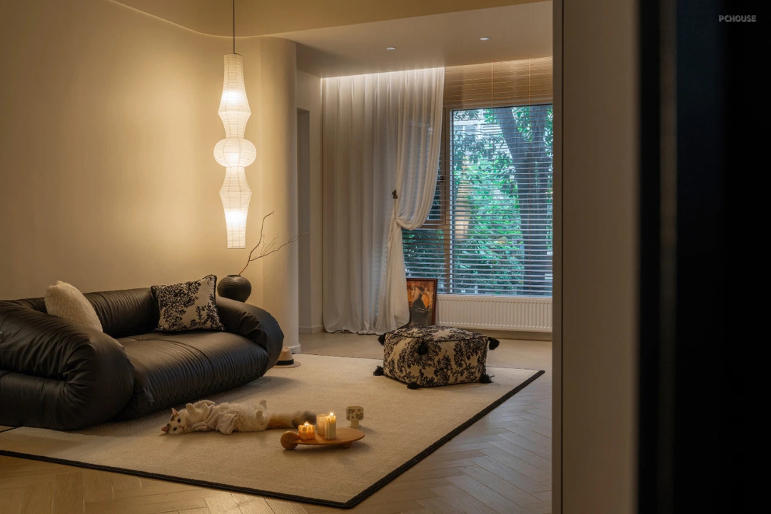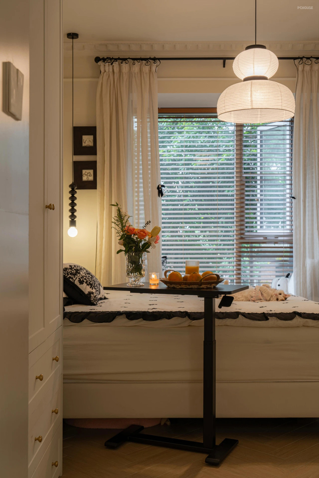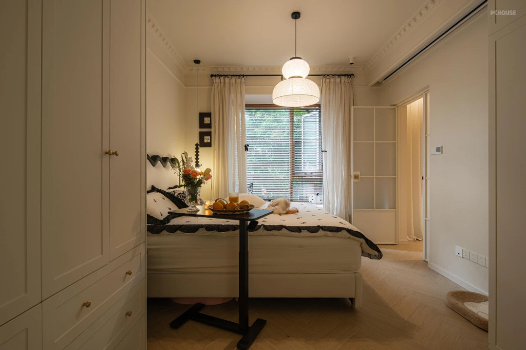 主卧室的窗帘按照梦琪的喜好设计的,没有做传统的满帘,而是增加了层次感设计上了落地沙沙+百叶窗帘的设计组合,搭配纸灯氛围感特别好。