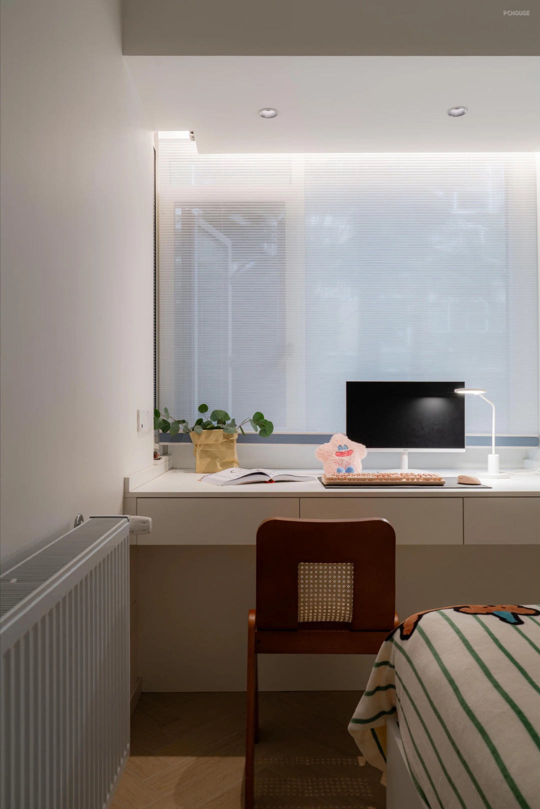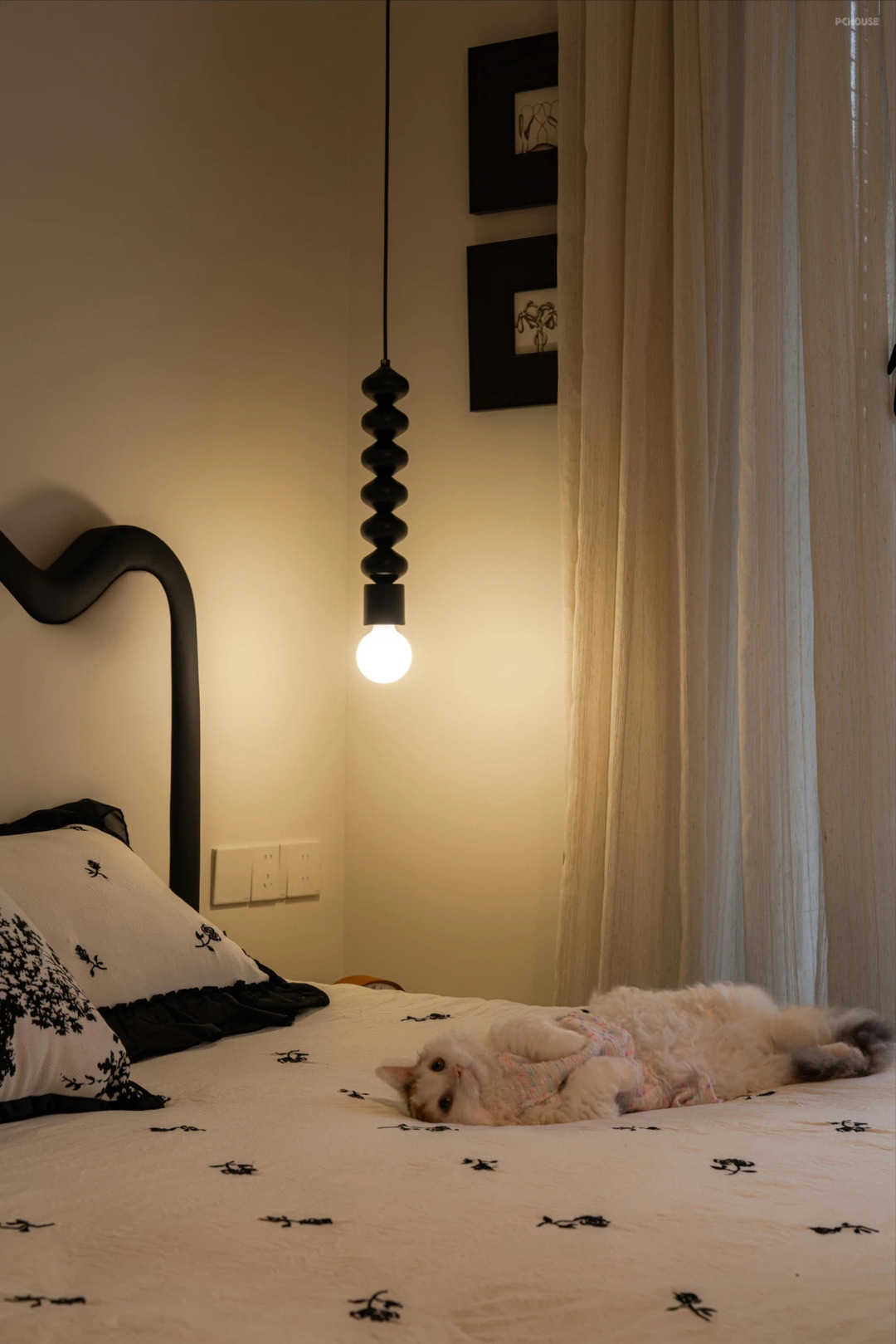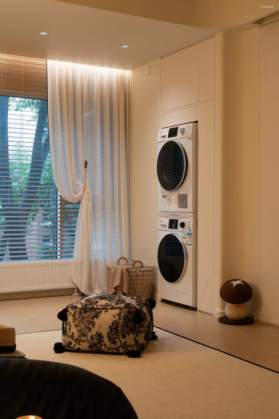 主卧室的窗帘按照梦琪的喜好设计的,没有做传统的满帘,而是增加了层次感设计上了落地沙沙+百叶窗帘的设计组合,搭配纸灯氛围感特别好。