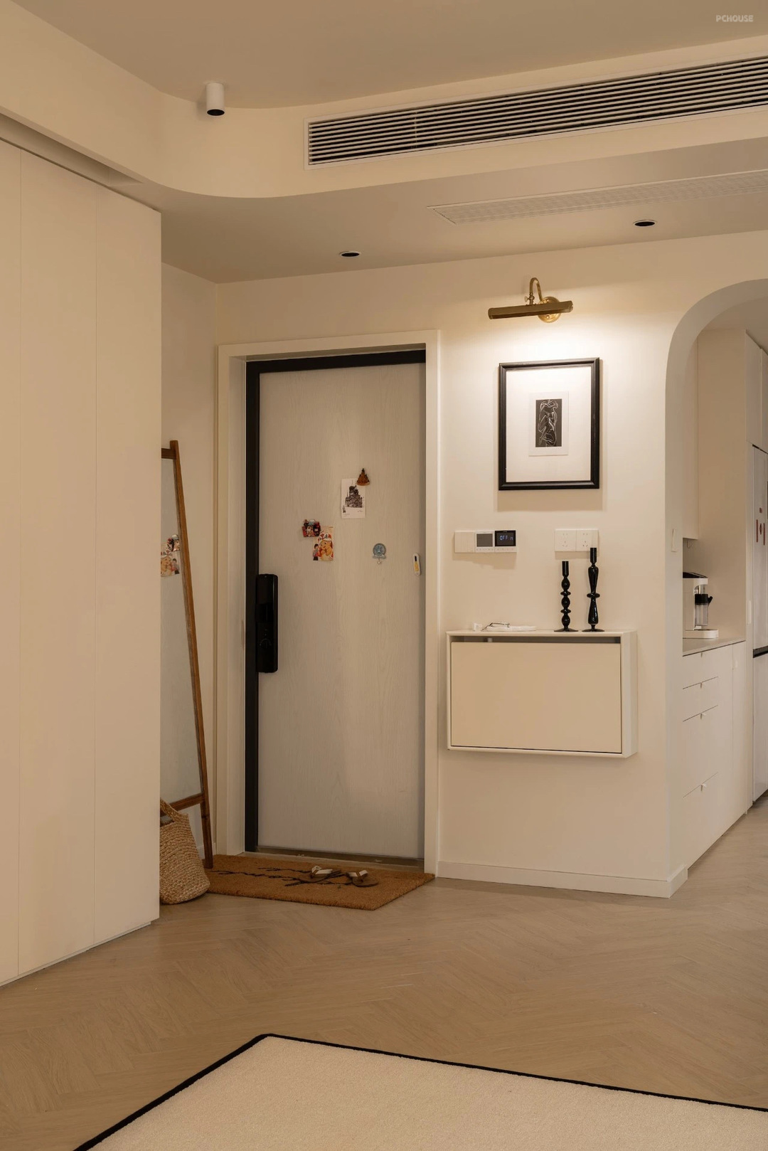 从客厅看门厅的大场景,大门也是更换了的,定制了内部白色,上面也贴着梦琪的冰箱贴;把原本的餐厅和厨房门洞打开设计成圆弧形与顶面的圆弧呼应~