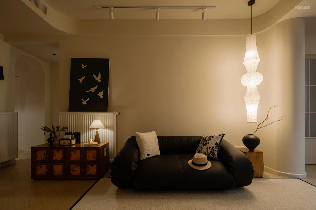 考虑到老房子的保暖性,还是选择了墙暖,但是不影响软装的打造,这个沙发就是梦琪最开始看上的,围绕这个沙发,我搭配了老木头的凳子和纸灯笼。