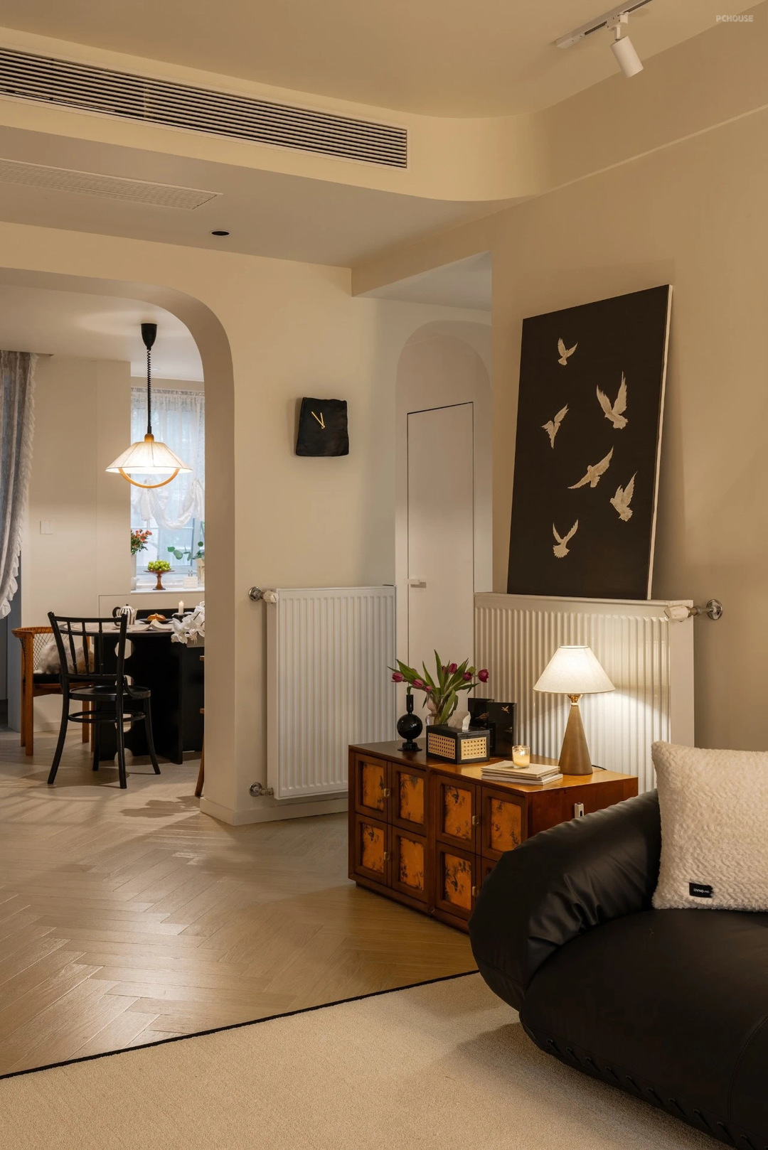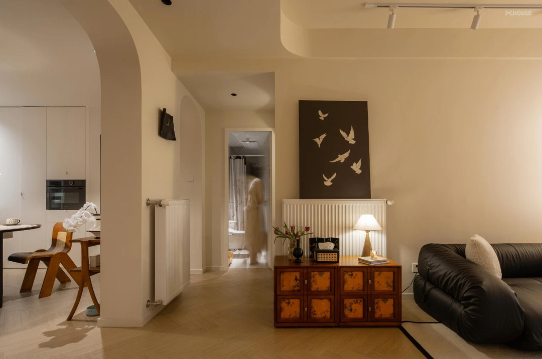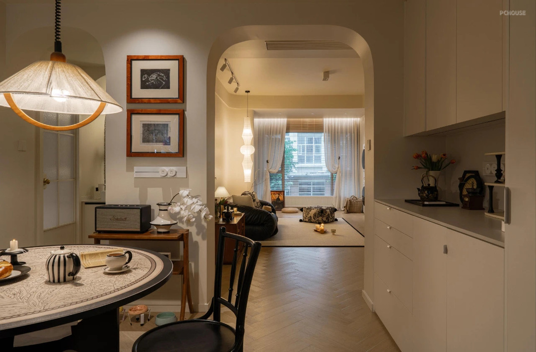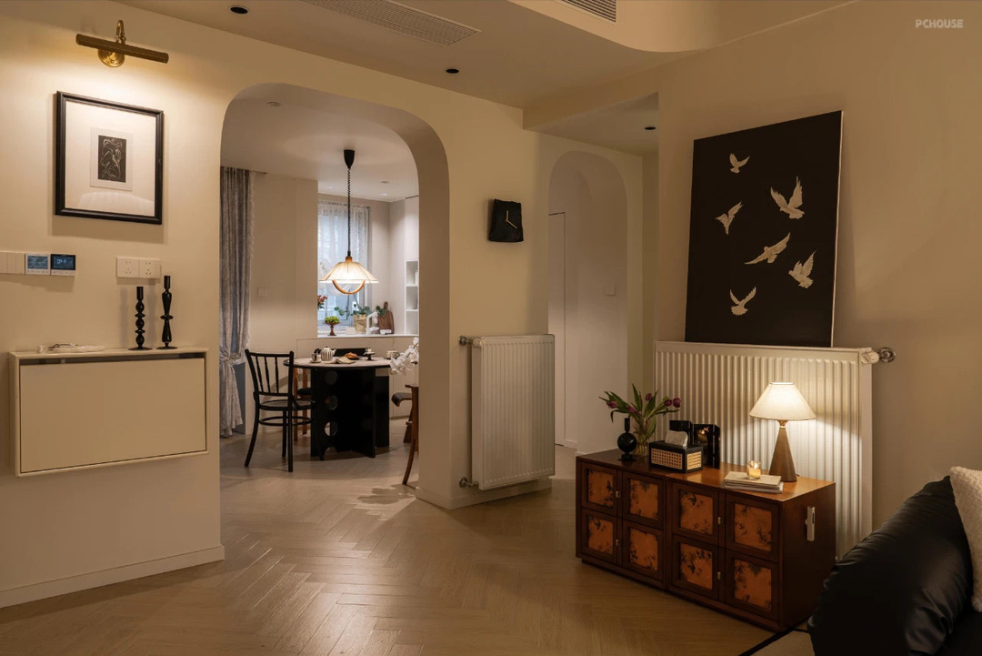 从餐厅看客厅,通透有氛围感~在两个拱形造型门洞中间,选择了一个装修几,陈列了蓝牙音响,上方挂画增加餐厅的软装氛围。