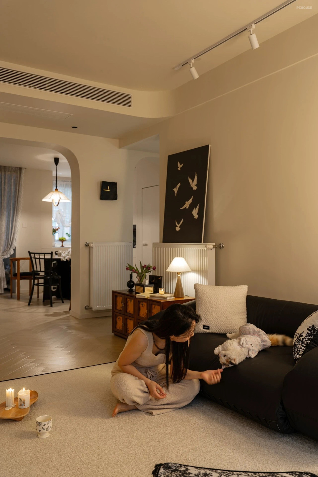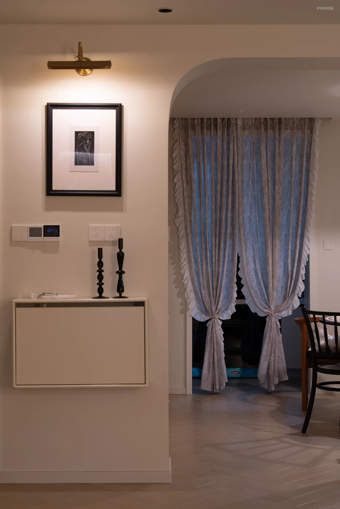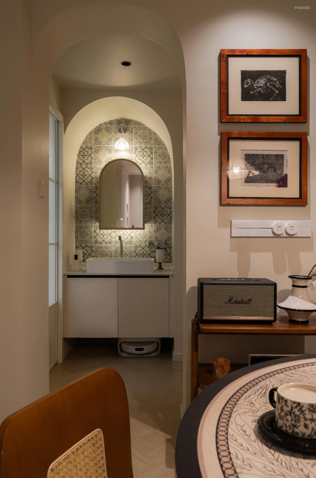 从餐厅看客厅,通透有氛围感~在两个拱形造型门洞中间,选择了一个装修几,陈列了蓝牙音响,上方挂画增加餐厅的软装氛围。