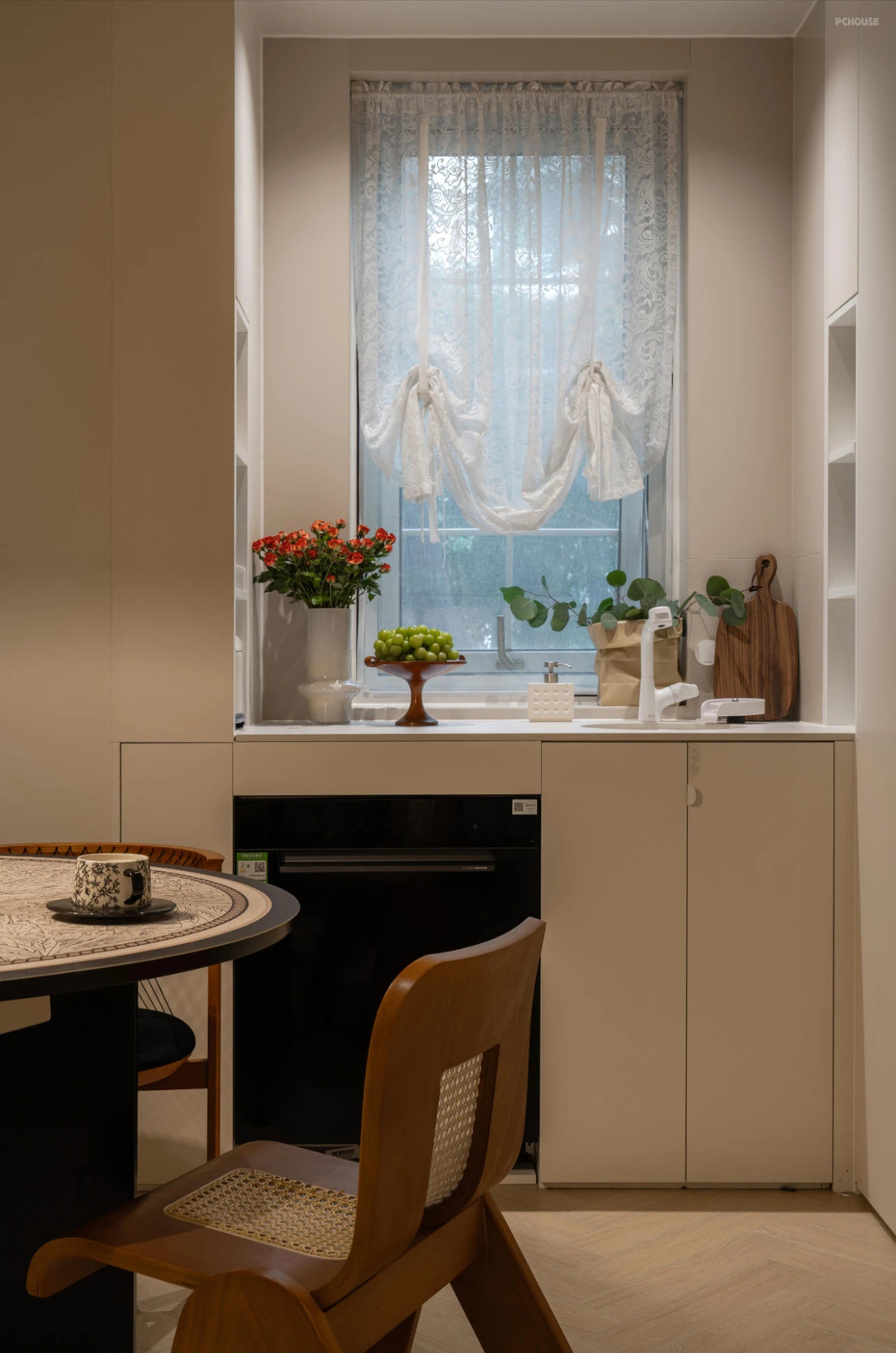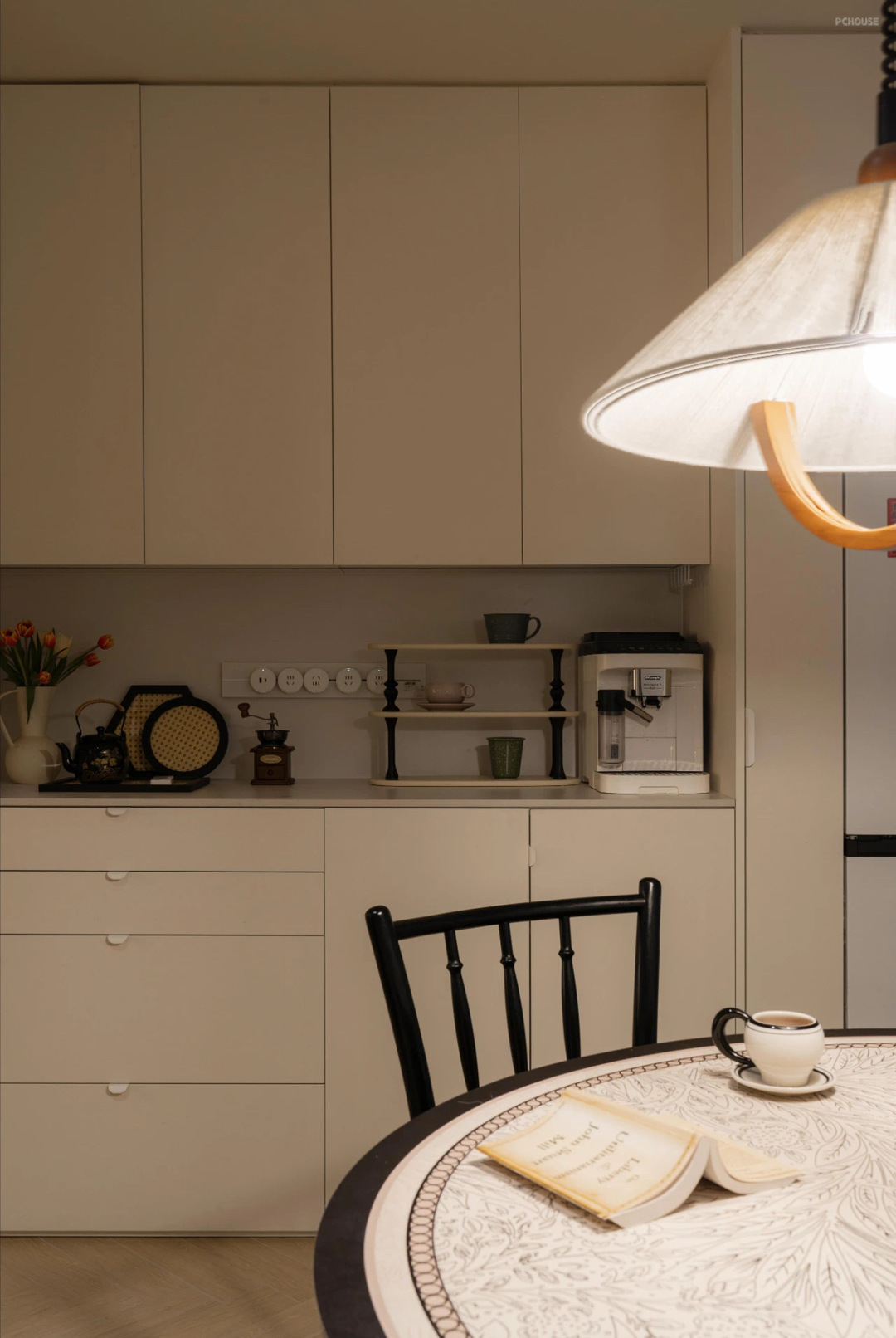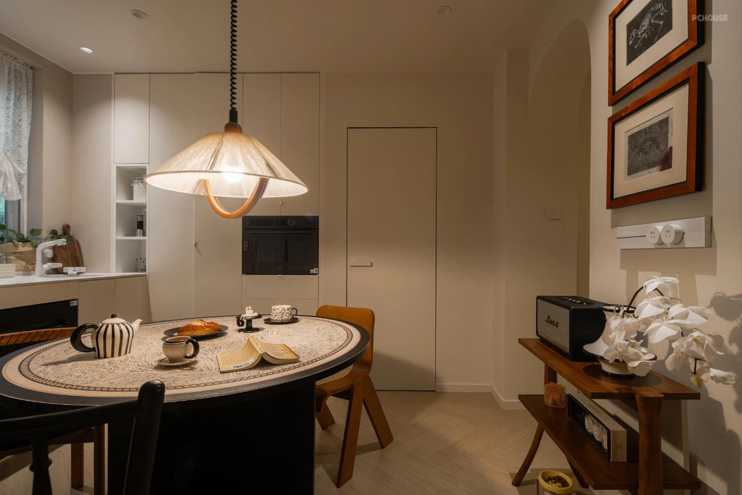 先还是来看看中西厨餐厅区域的设计,其实原本硬装设计的时候,我设计的是岛台。但全屋定制结束之后,我跟梦琪讨论调整成一个圆桌。现在这个圆桌也成为了空间的C位。