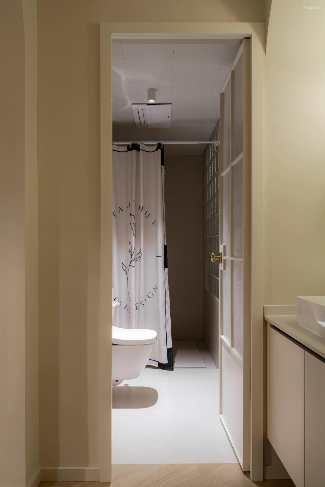 从这个位置可以看到浴缸,浴缸与淋浴房中间我选择了玻璃砖,这样让整个私密的空间更通透。