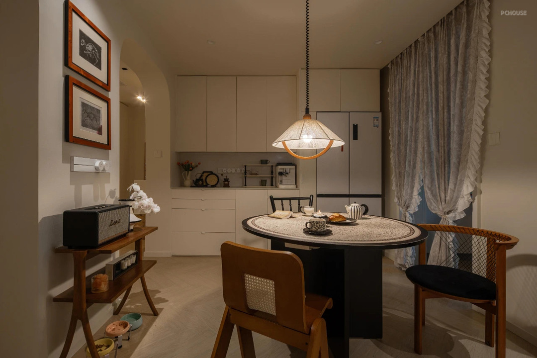 餐厅中间圆桌是整个空间的C位,围绕圆桌我选了伸缩式吊灯,中古款餐桌搭配精选的网红款餐椅。