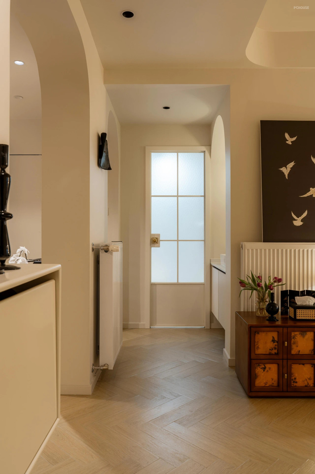 这个角度是从客厅看餐厅,可以看到2个拱形门洞,中间就是拆不掉的墙体正好安装了暖气片。