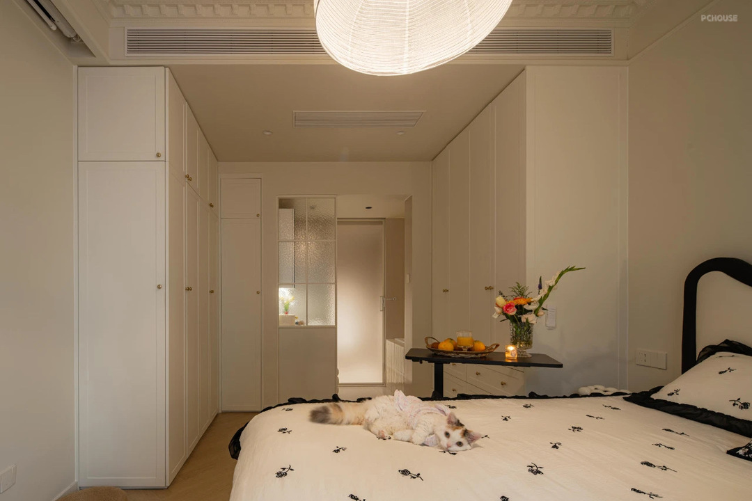 主卧室是甜甜的法式风格,所以从硬装来说顶面和柜子都选择了法式风格,顶面做了石膏线条,衣帽间的柜子也是选择了线条款。