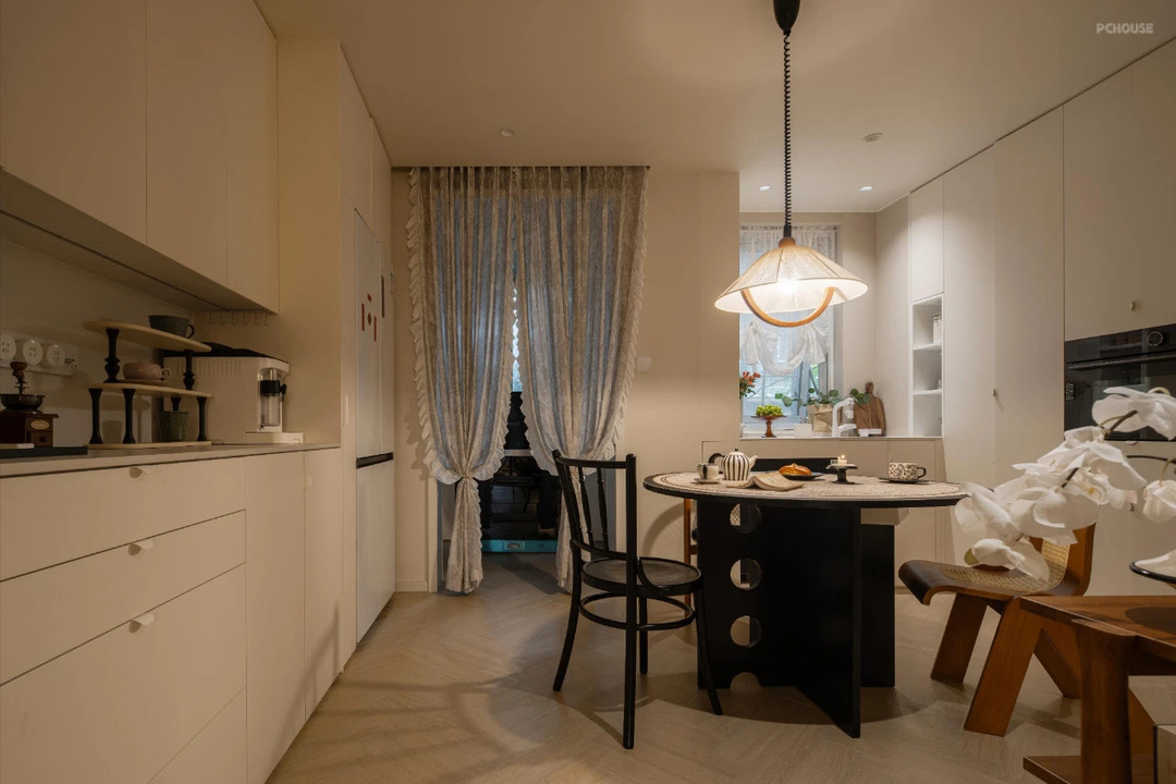 备餐柜与冰箱柜一体,冰箱柜旁边看到有一个缝隙是我留给吊趟门的,考虑到使用和预算,直接做了一个造型帘,不用帘子的时候可以全部拉到轨道缝隙里,需要氛围感的时候,一拉就有~
