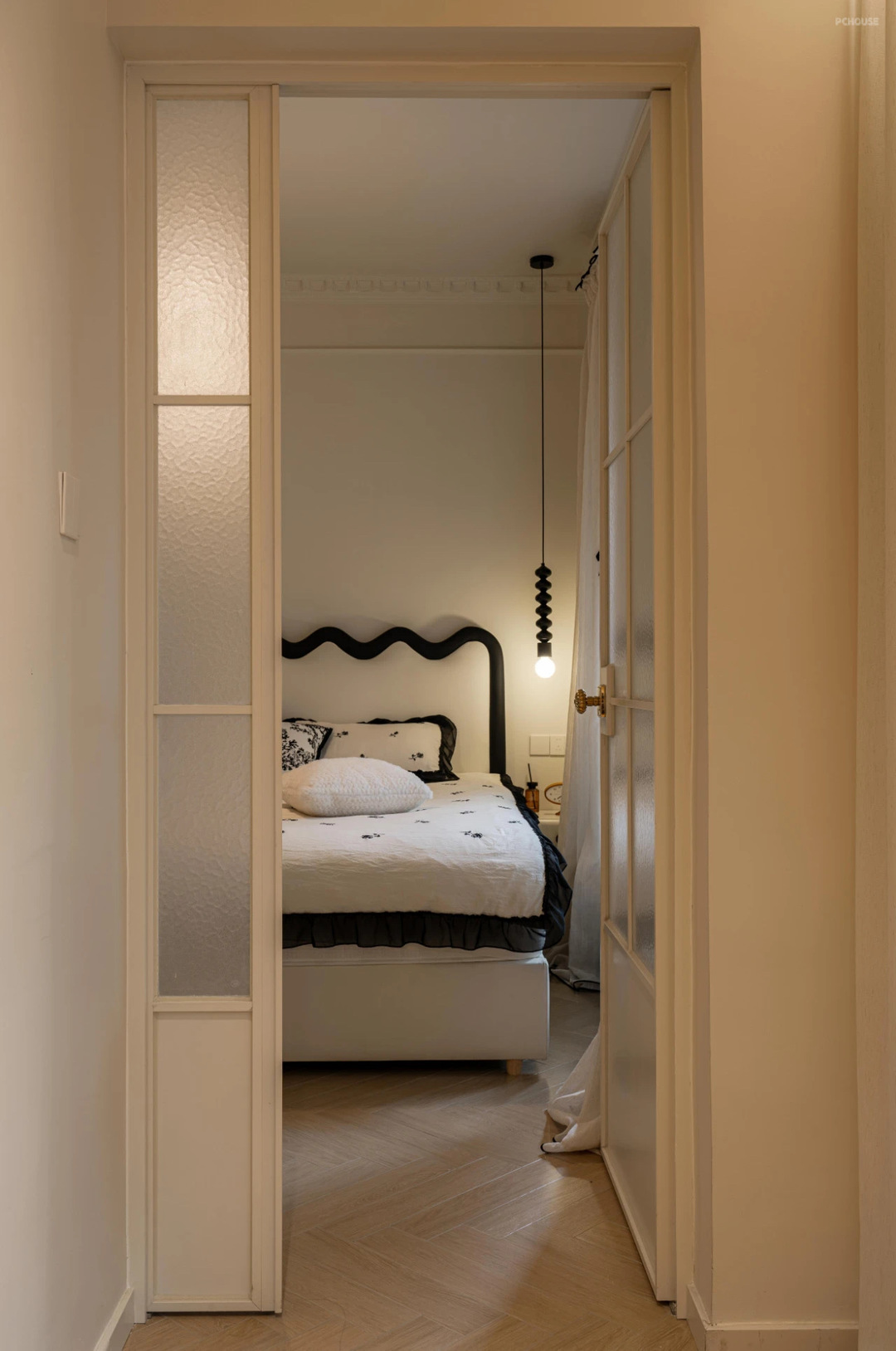从阳台进入主卧空间,主卧字母门选择了经典的法式玻璃门~