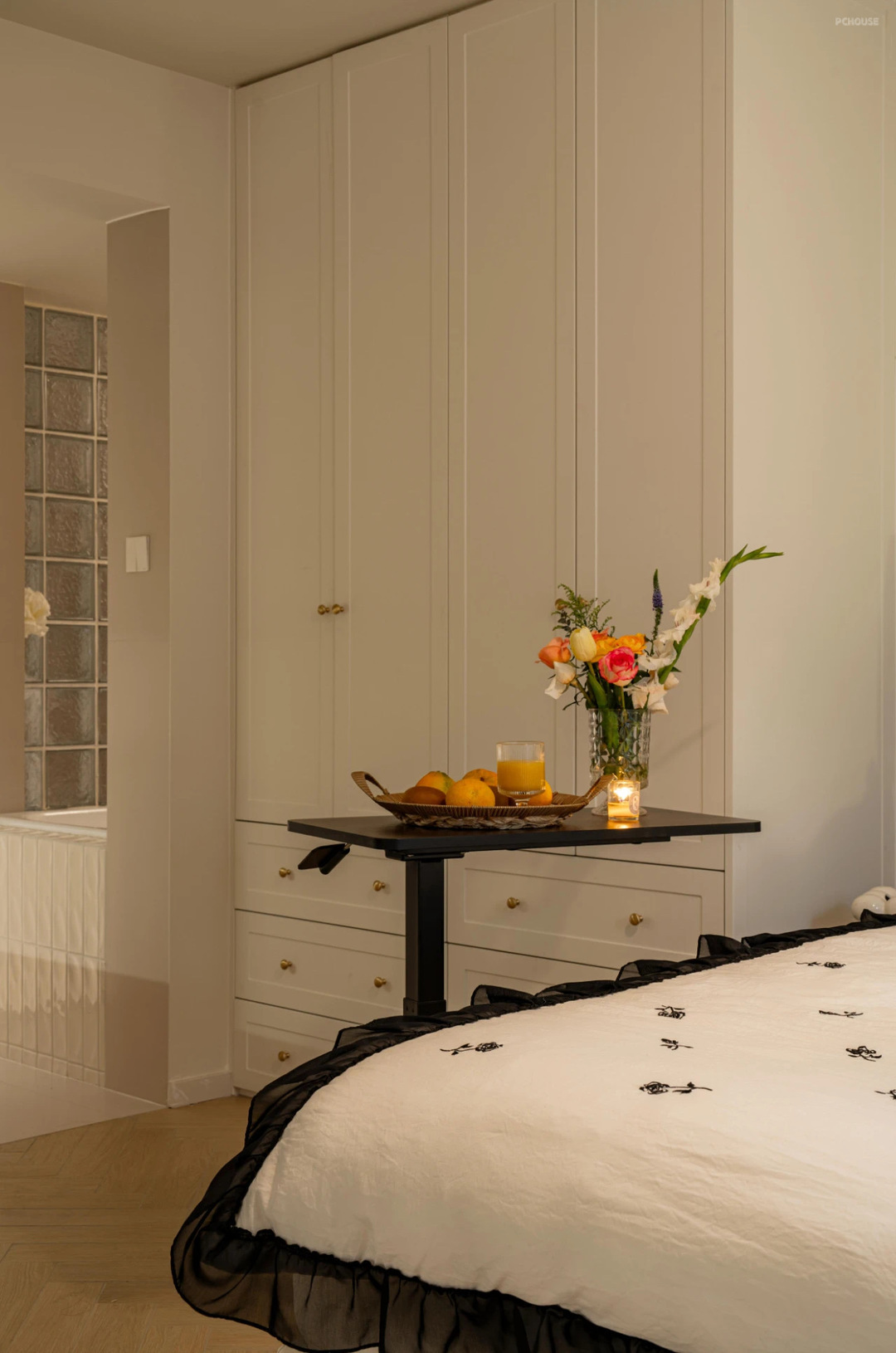原本卫生间一分为二,左侧空间,我设计了独立的专属于梦琪的干区化妆区,以及一个梦幻的嵌入式浴缸空间,这两个功能室嵌套在主卧室,相当于一个主卫;