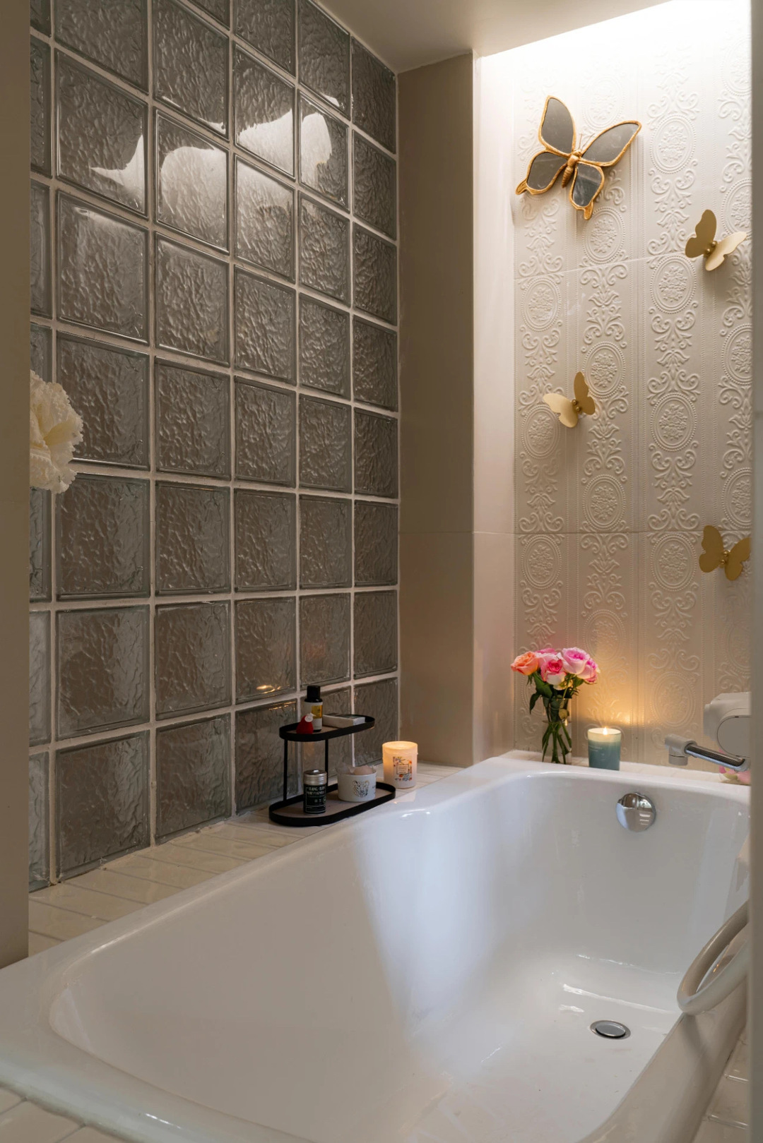 梦幻的嵌入式浴缸,这个位置因为非常个人,所以我增加很多装饰感的东西,蝴蝶的镜子+蝴蝶的挂钩,既有形式又兼具实用功能~����