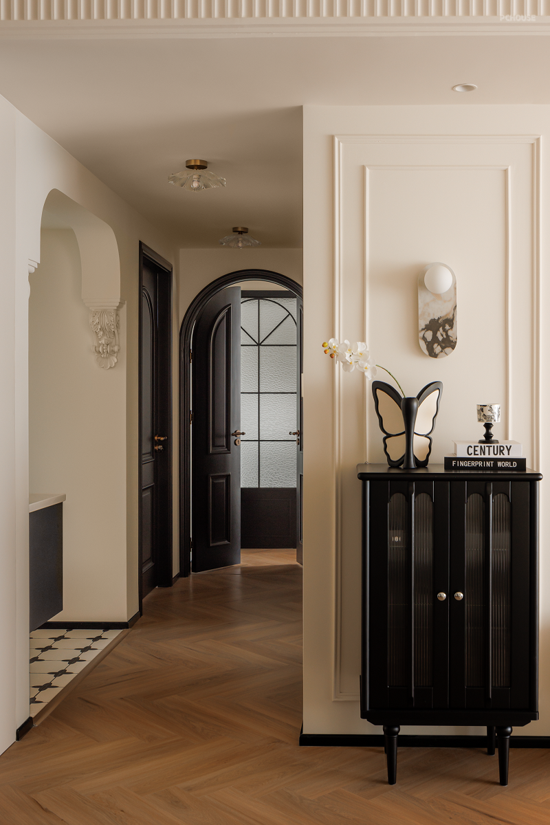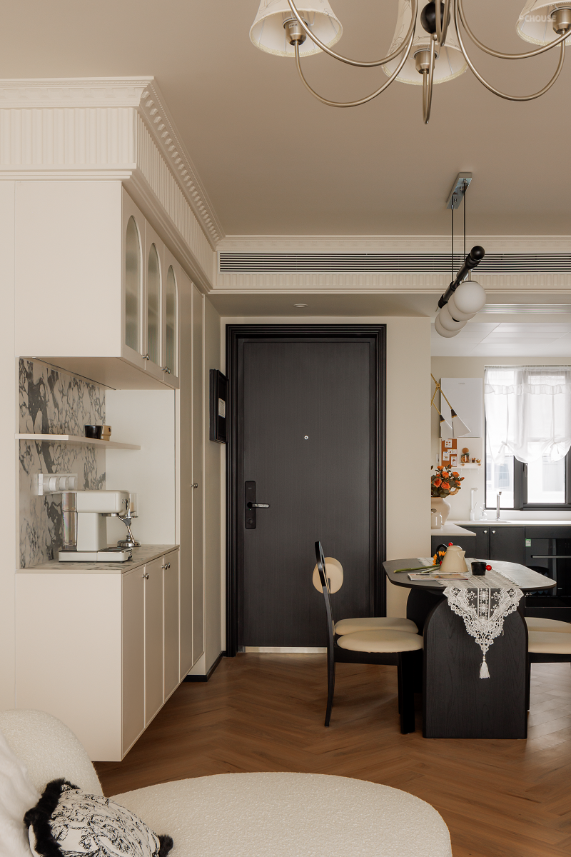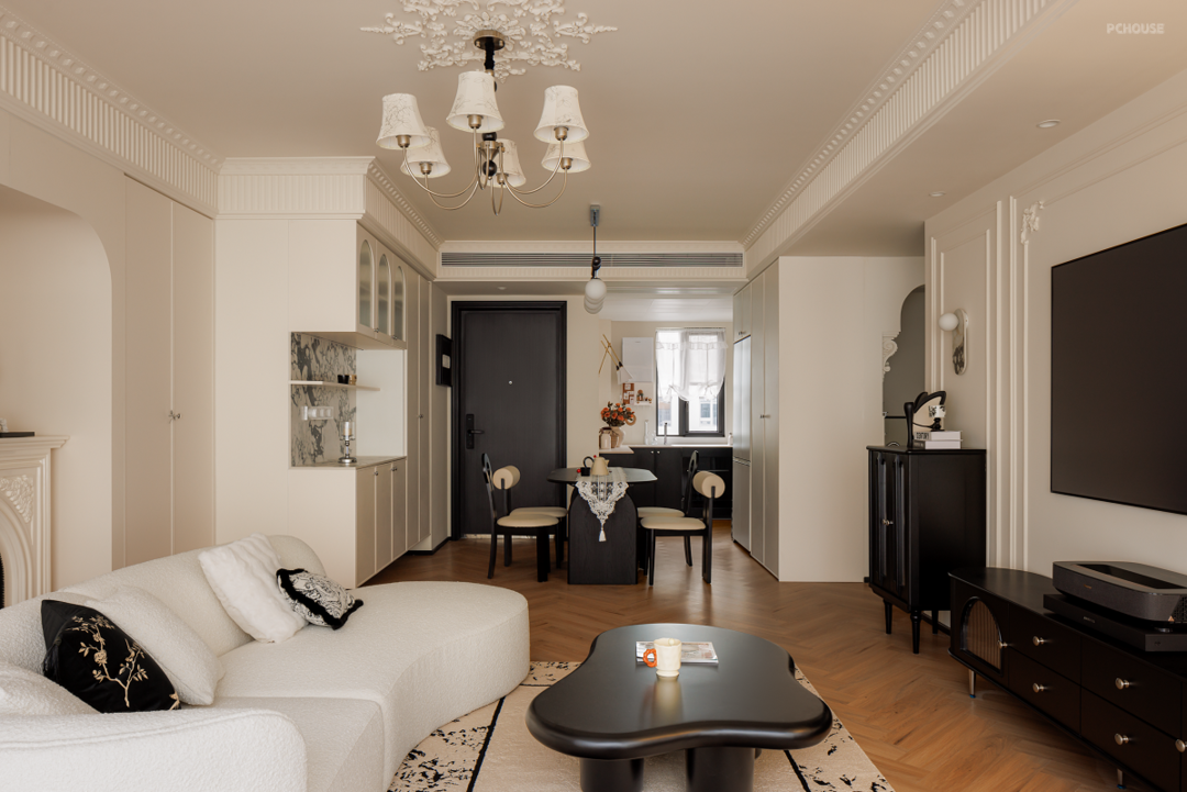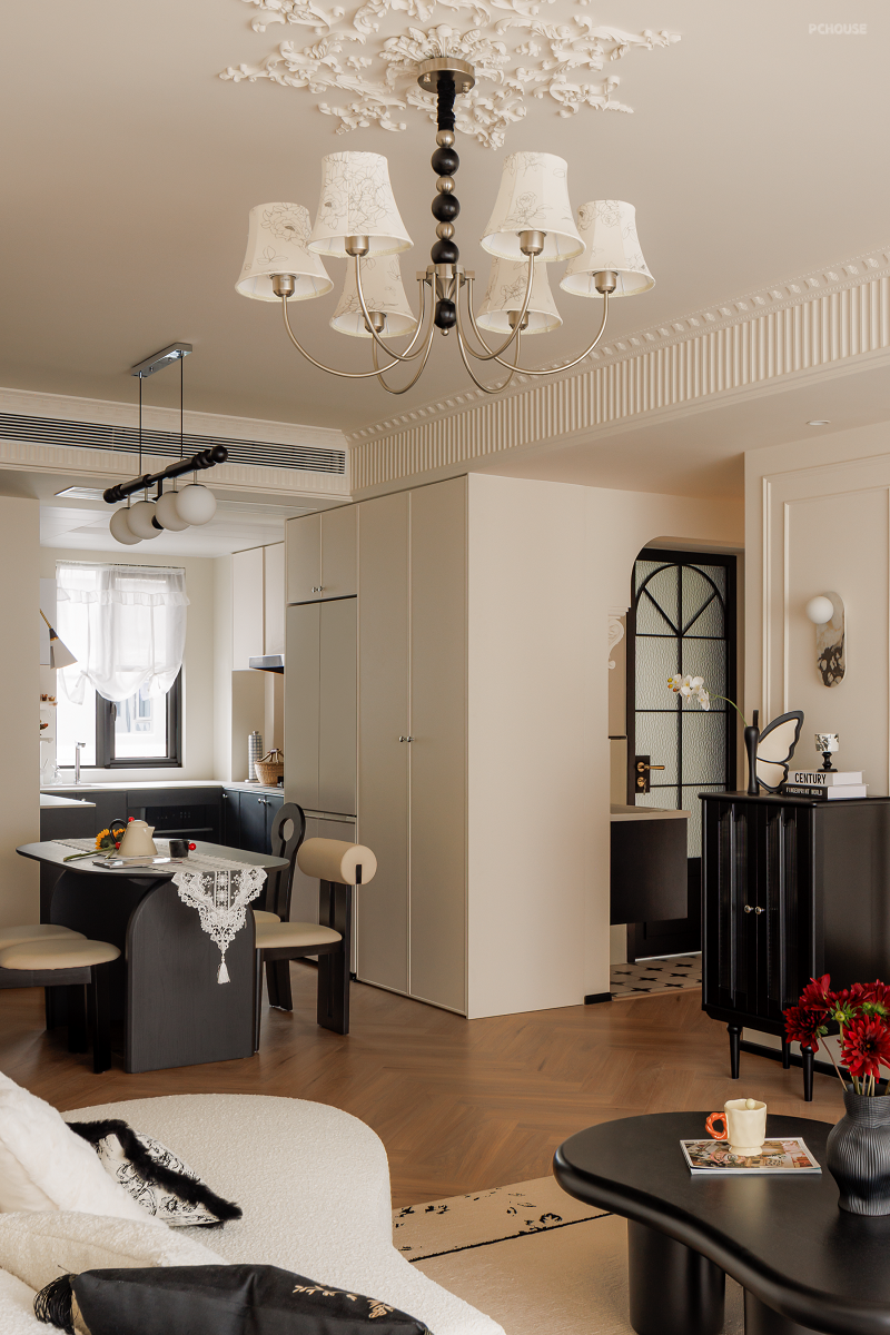 原始的精装交付并不能满足业主的审美需求,所以在前期沟通后,我们在不大改格局的基础上,遵循业主的喜好与感受,用黑白法式给空间定调,借助开放式布局让家人之间无间相处,自由格局、多个环形动线重塑交互空间,在满足家的通透同时,居住舒适度也整体提升不少。