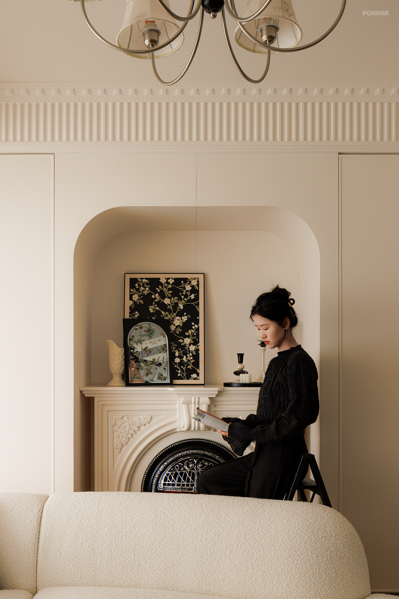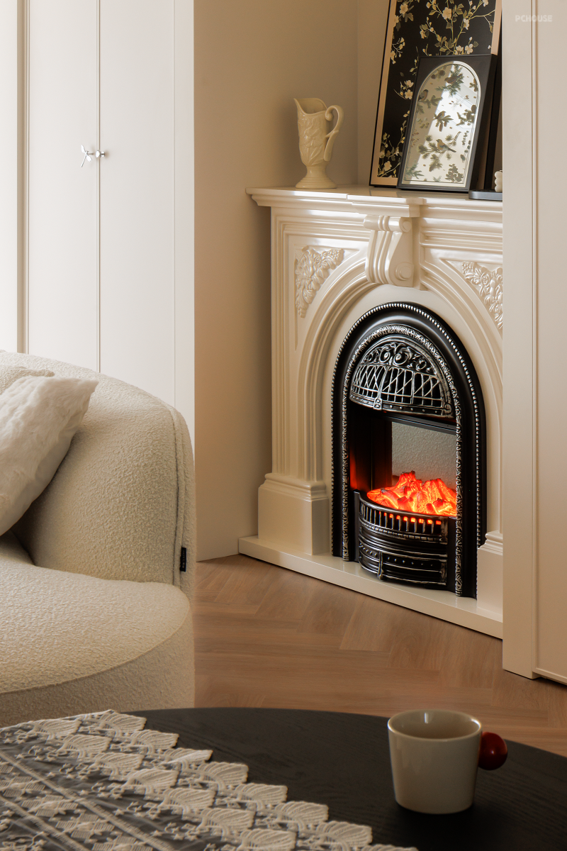 小横厅给生活带来更多可能性,沙发不靠墙,背靠储物柜,拱形造型和装饰壁炉也在氛围营造的同时集合生活切实所需。
