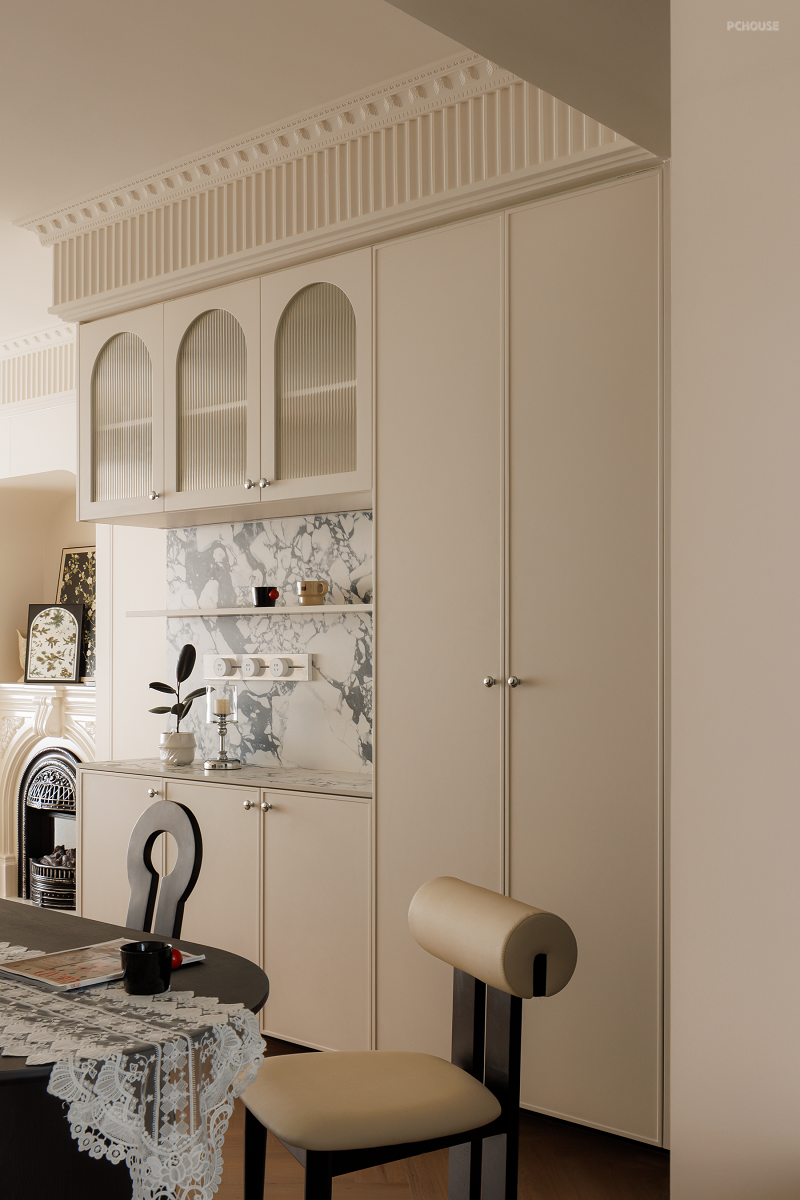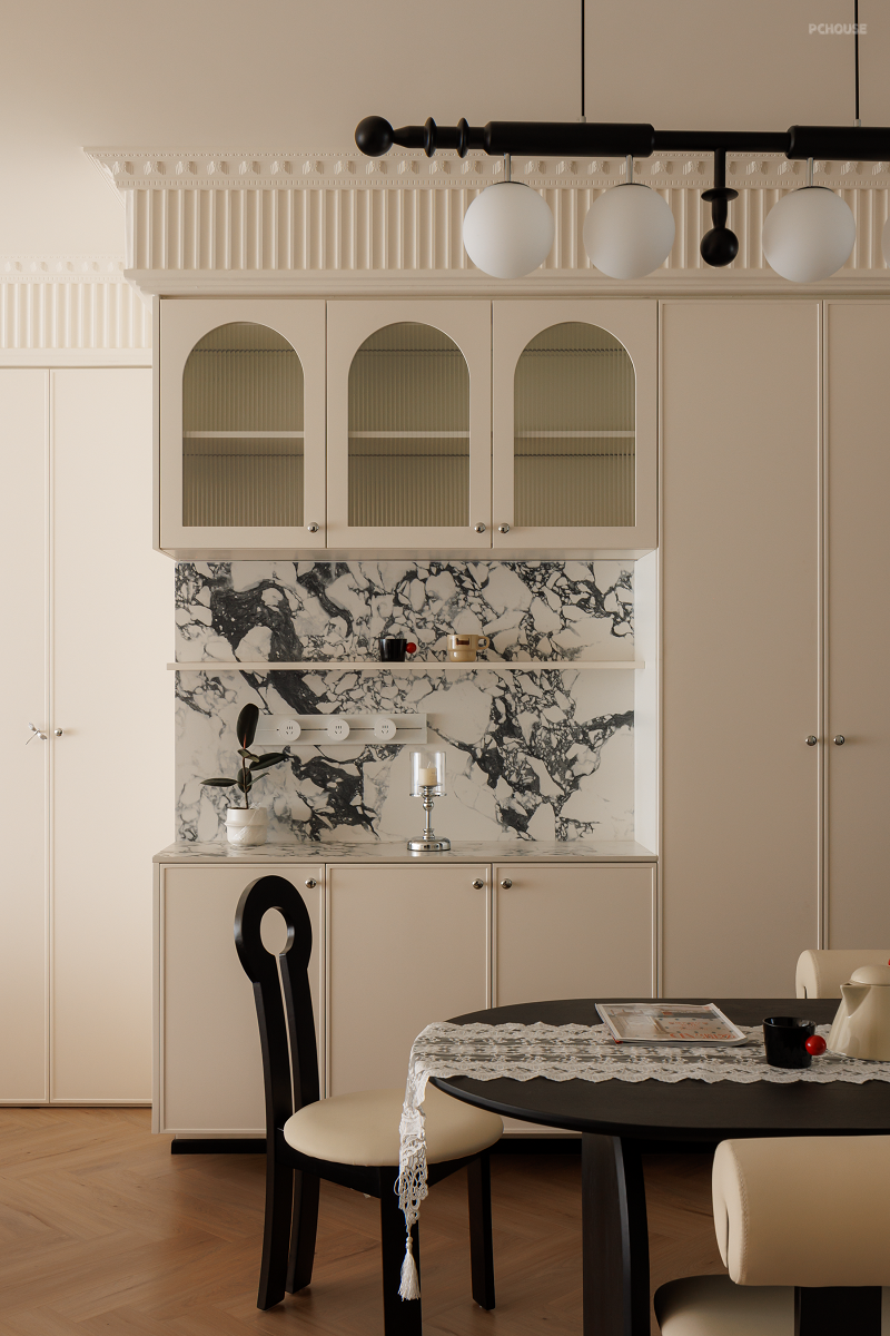 入户见厅的户型,沿着墙面设置了悬空柜,分体式设计丰富餐厅和玄关的收纳方式,拱形柜门+长虹玻璃的搭配组合不仅让装饰块面变得丰盈,也让柜体更通透轻便。石材的加入也增加了精致度。