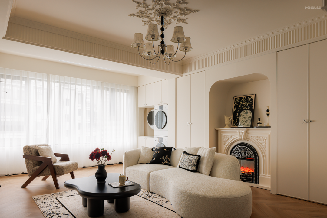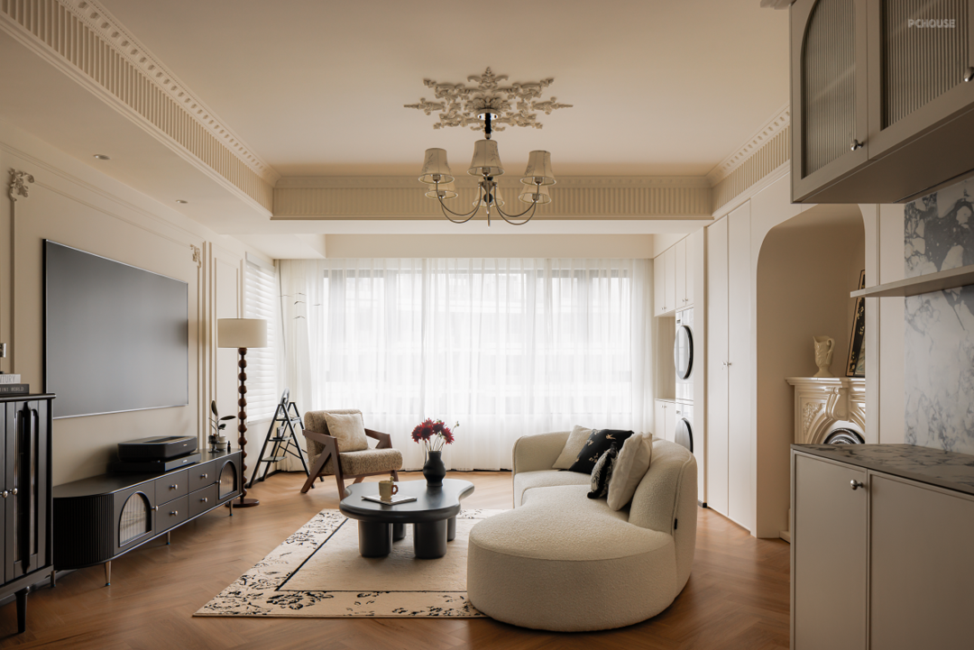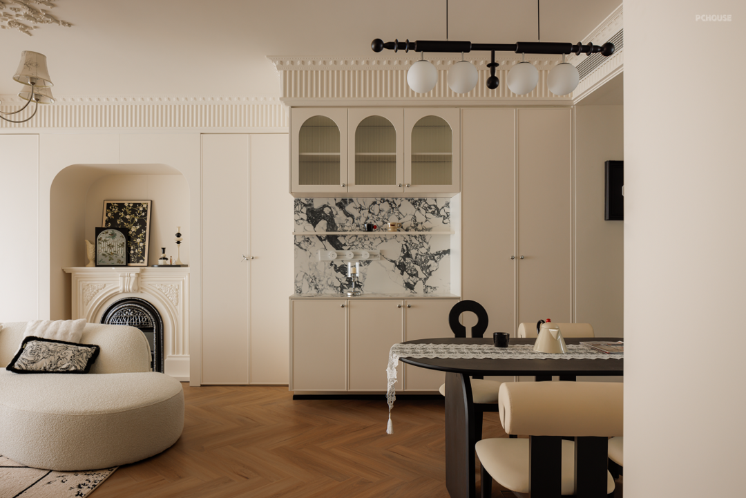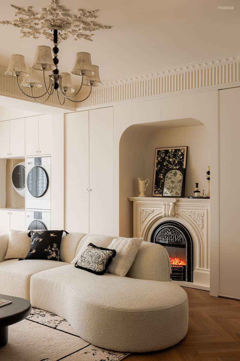 在原始精装交付的吊顶上包裹虎头线和钢琴键,法式线条、灯盘雕花、圆润弧形软装等元素共同渲染浪漫空间。