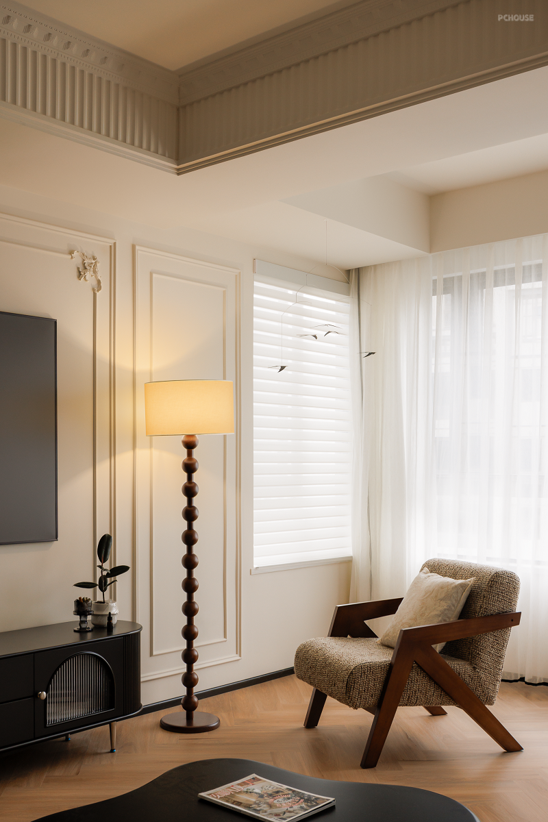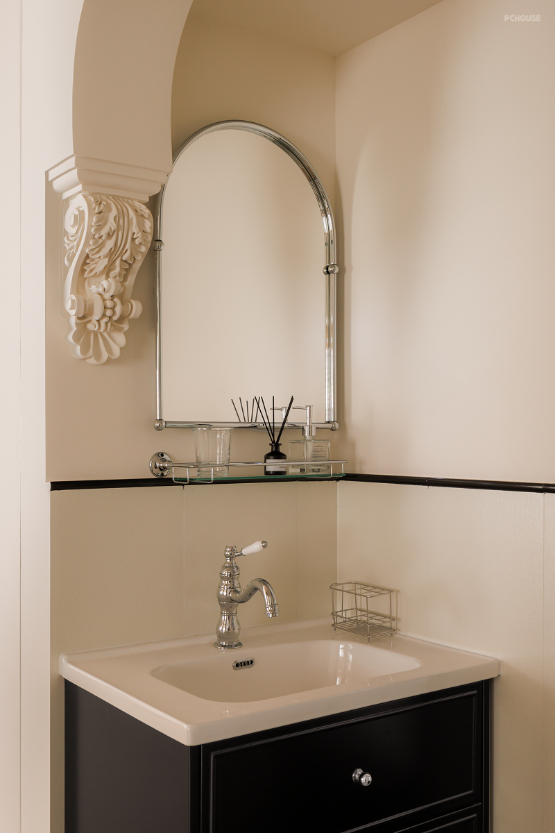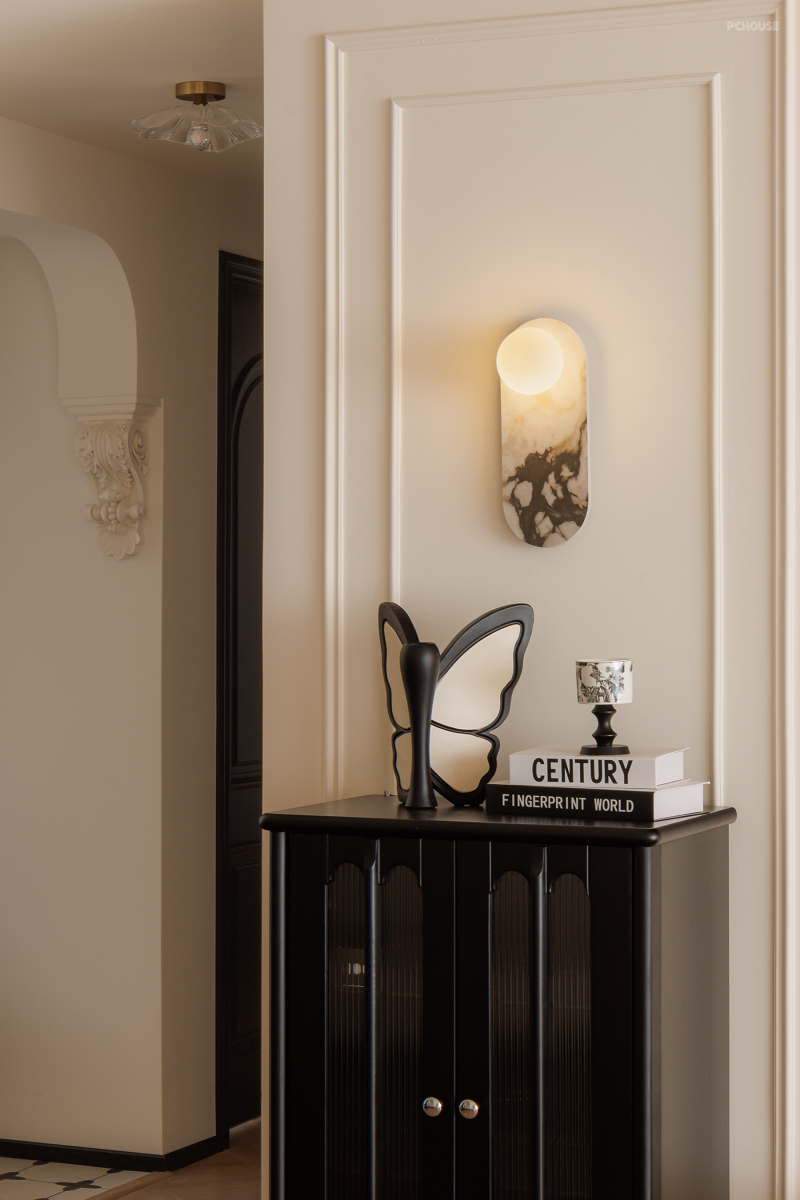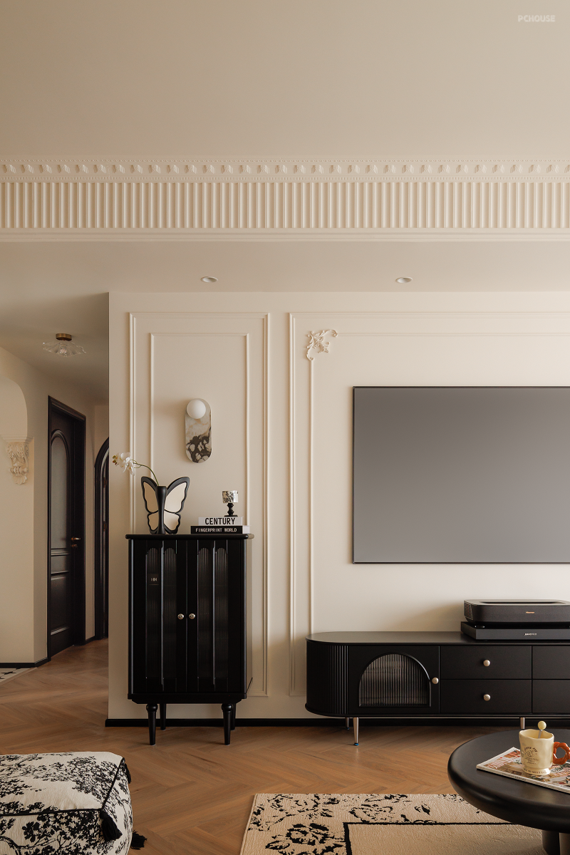 在原始精装交付的吊顶上包裹虎头线和钢琴键,法式线条、灯盘雕花、圆润弧形软装等元素共同渲染浪漫空间。