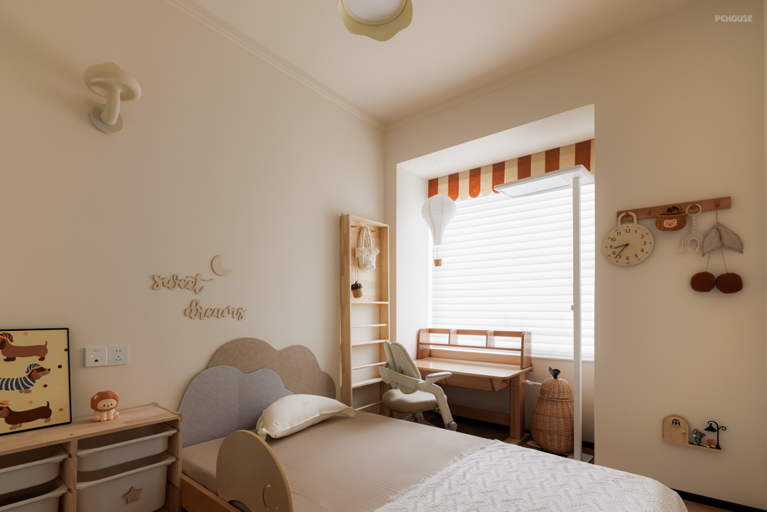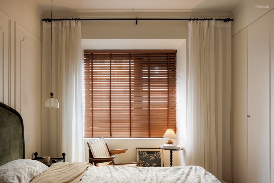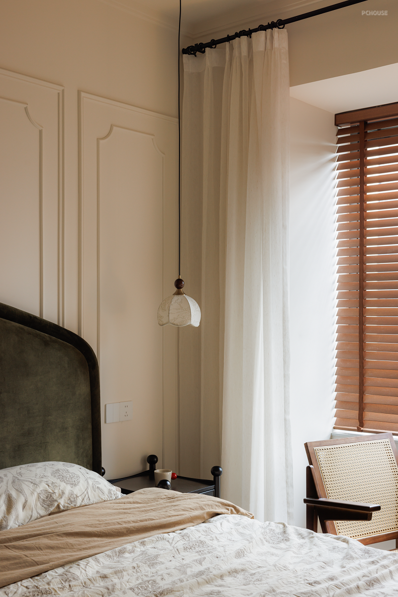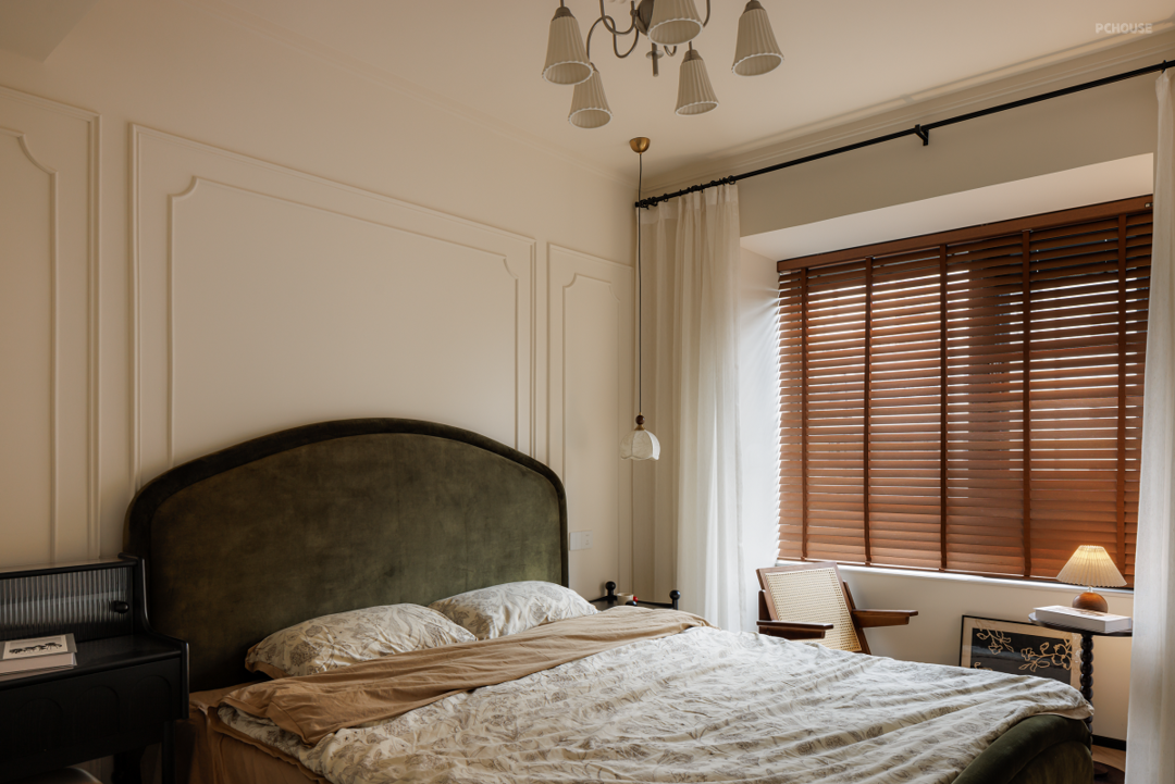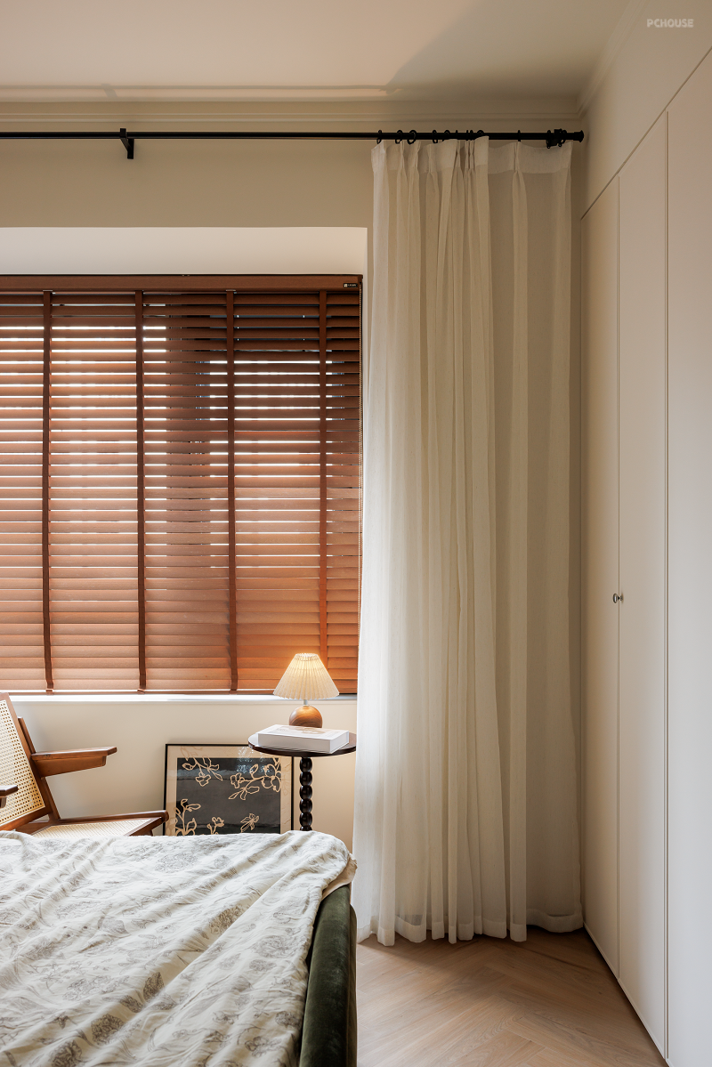 延续暖色基调,床头用精简的法式线条勾勒浪漫氛围。主卧格局不改,借助床尾整面墙做衣柜增加收纳。