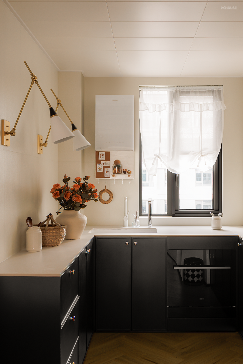 地面在不动地砖的基础上,铺上地板,给室内带来温润气息。“春雨”色号大面积在墙面铺陈开来,温柔又复古。黑色软装家具点缀,带来层次感和沉稳气质。