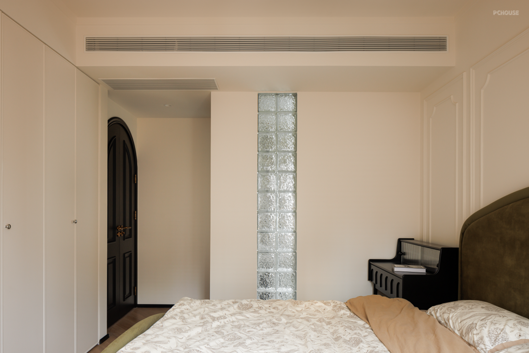 走廊尽头充满仪式感的黑色弧形双开门后,就是主卧空间。