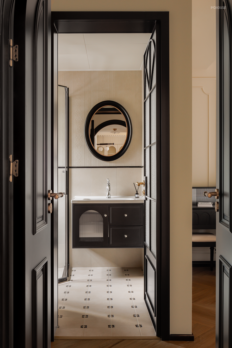 主卫的小花砖和半墙设计复古感拉满,玻璃砖优化采光,获得别样的空间感受。