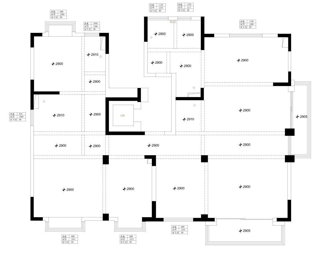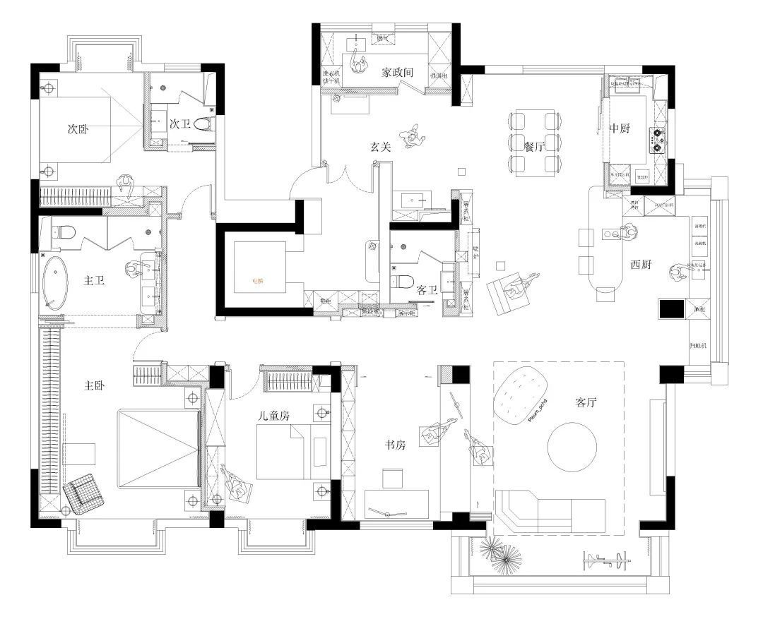 本案,位于淮海名邸,270㎡大平层,原交付是标准的四室两厅户型,拥有主入户及家政间主次两个门,家政间与保姆间空间较大,将近十多个平方,主入户视角下玄关很小,整体稍显局促,并未体现270㎡大宅该有的宽敞舒适。