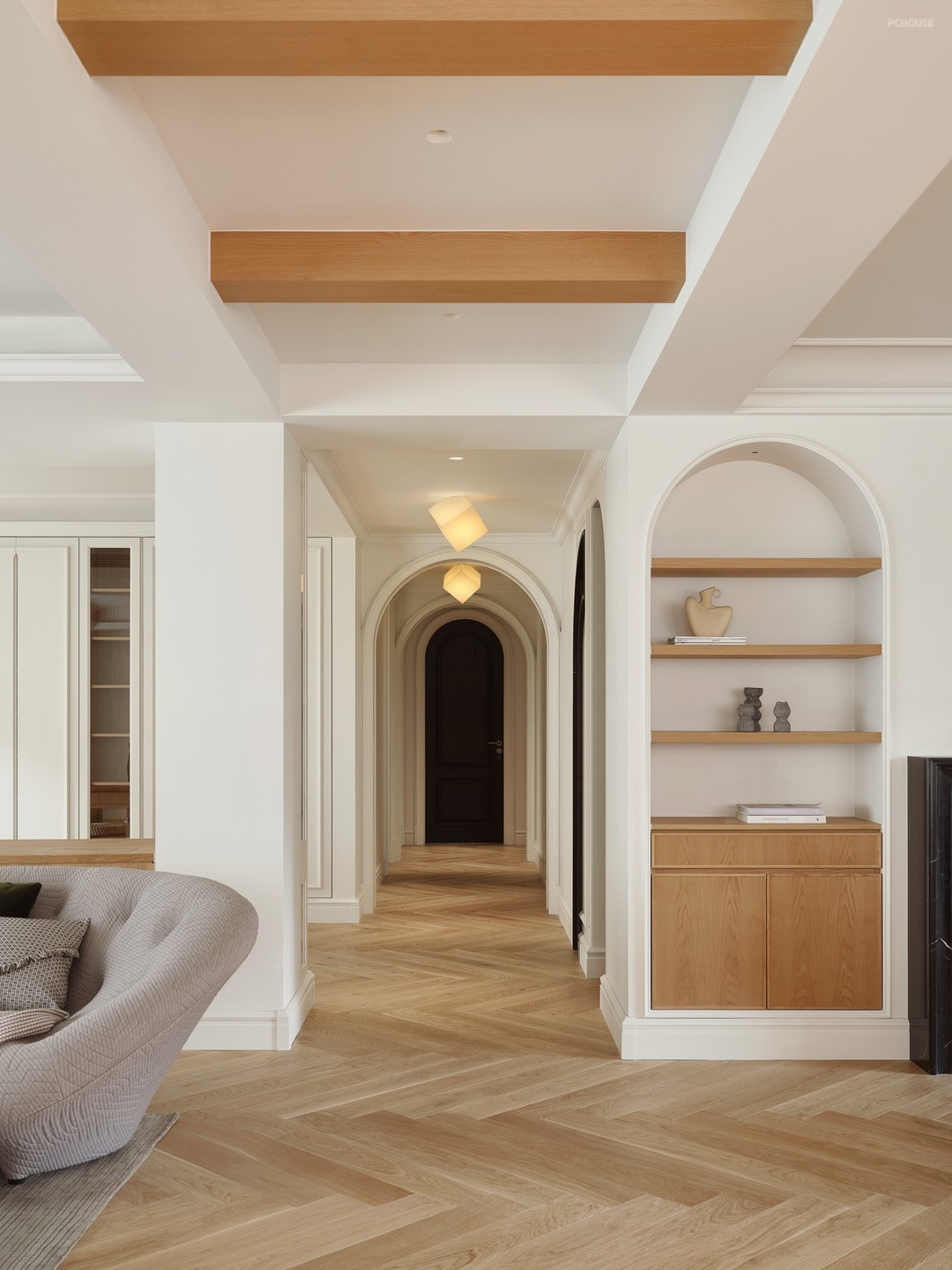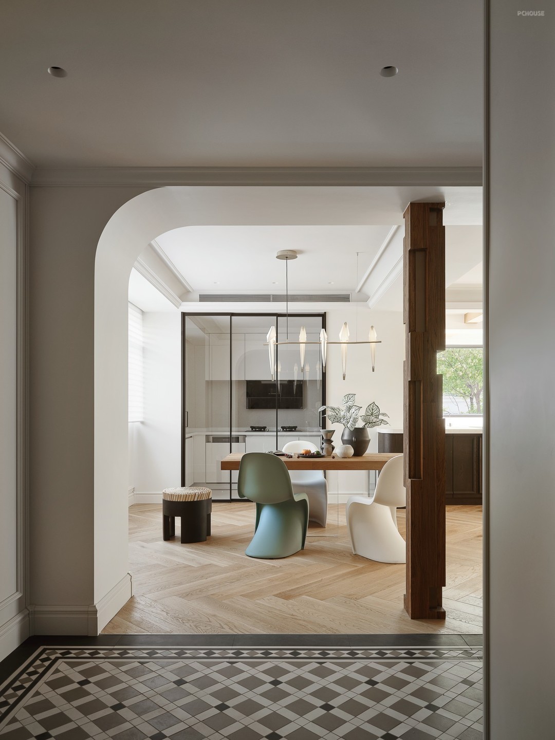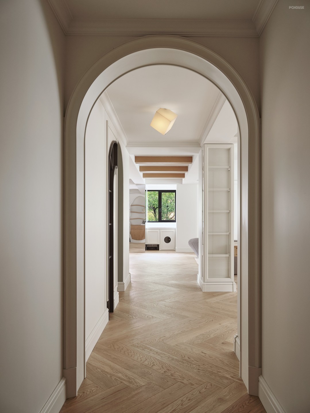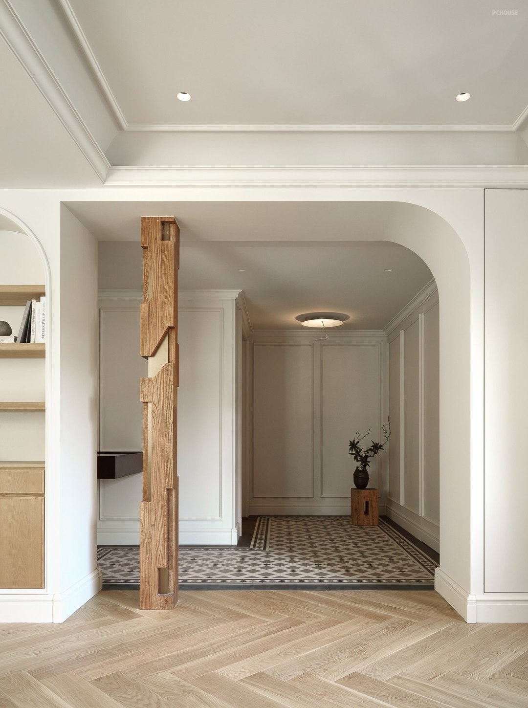 屋主是一对年轻夫妻,设计师定位了现代法式自然的空间氛围。布局规划上,设计师基于满足两人居住的基本需求,通过缩减家政区域的面积,有效释放了多余的空间。原本的保姆间被重新规划为玄关区域。原有的两个入口,则采取了封闭其中一个、将另一个升级为主门的策略,并在新的主门入口处增设了一个充满复古气息的入户玄关,进一步优化了空间布局与整体美感。