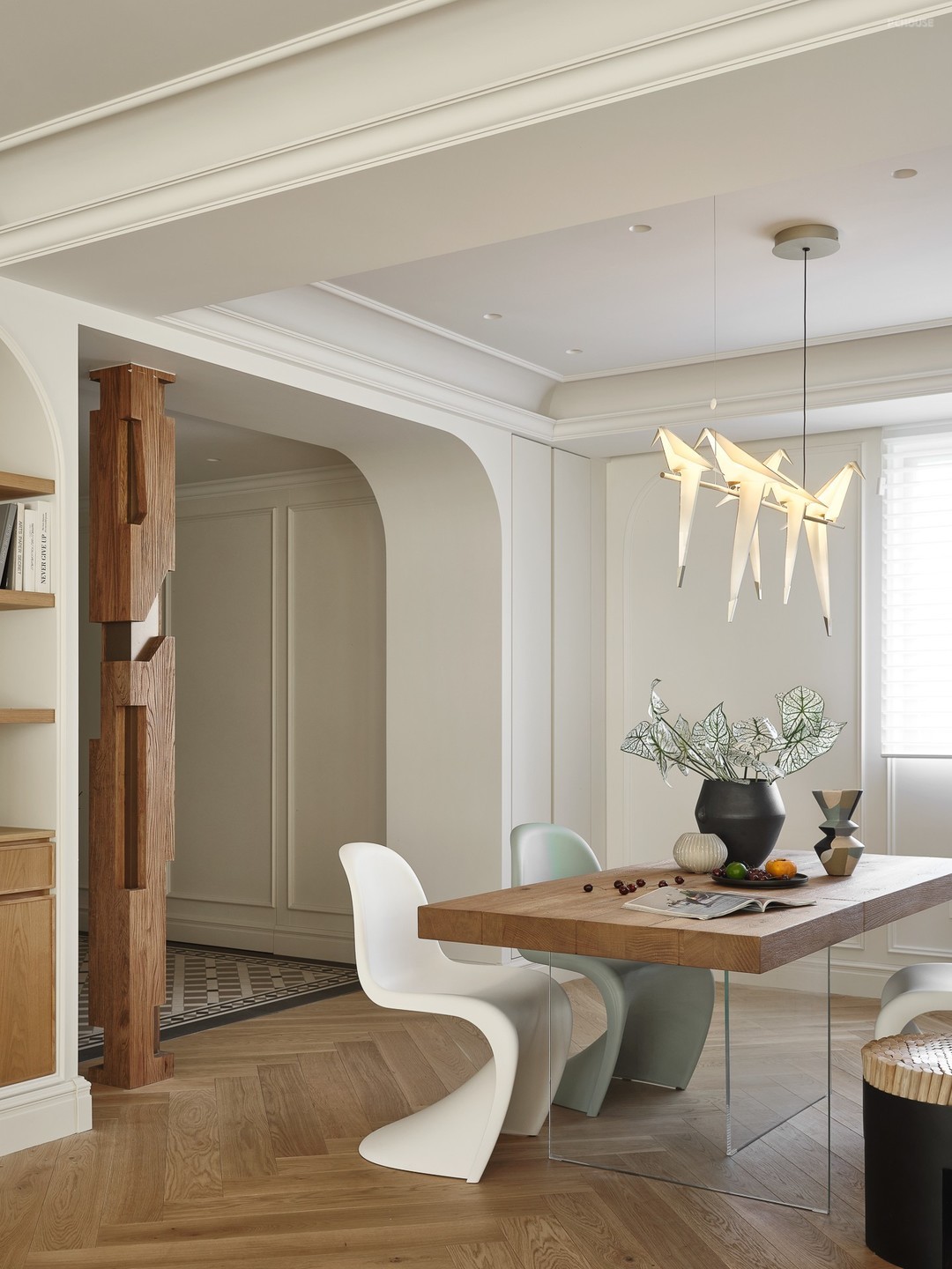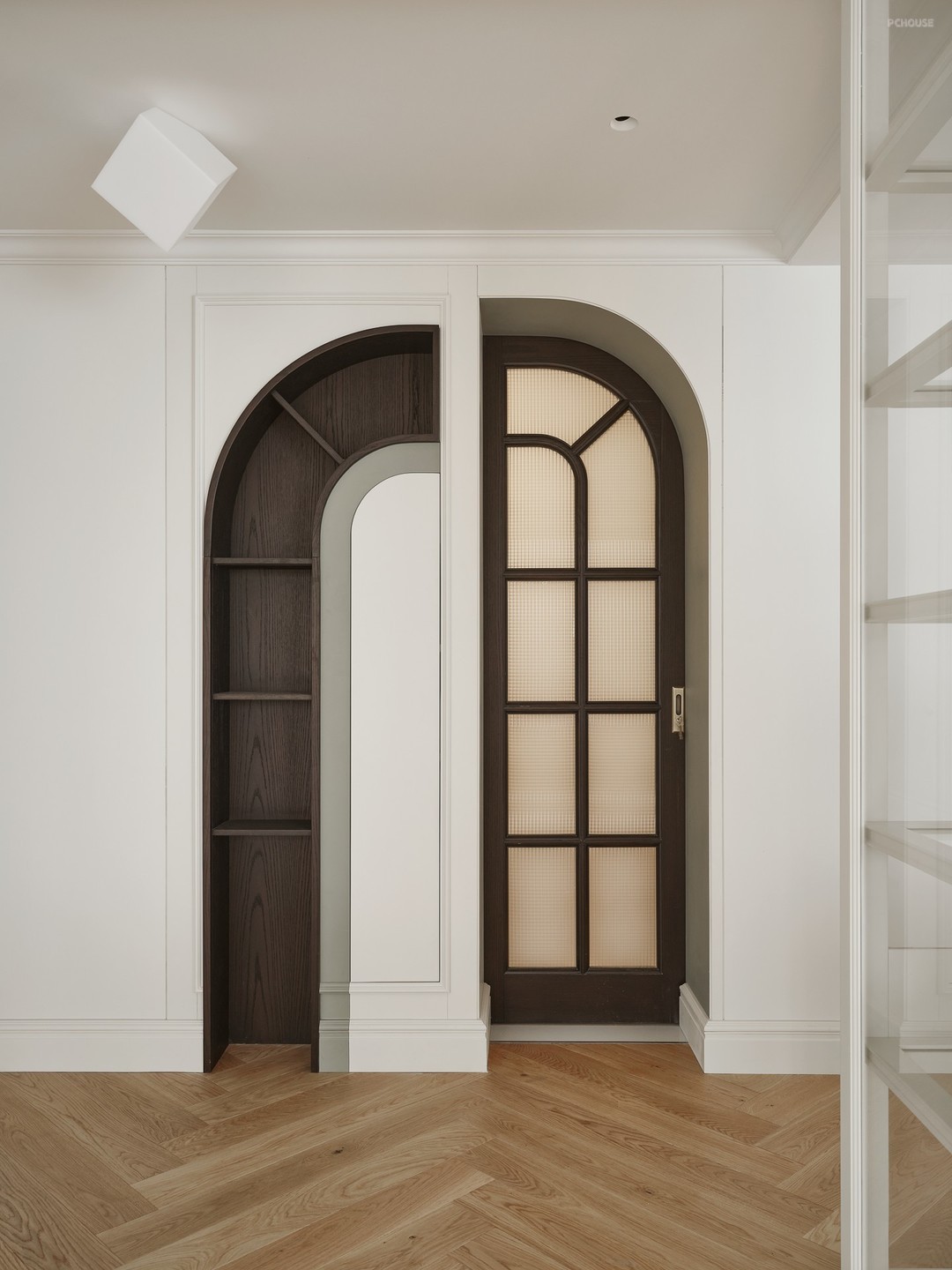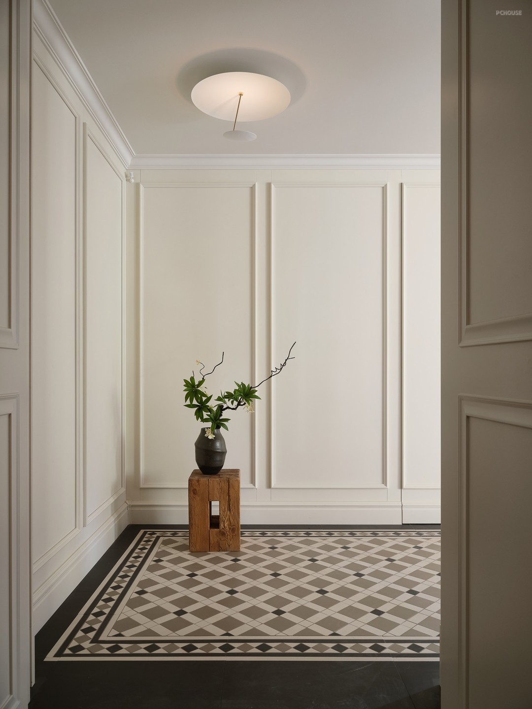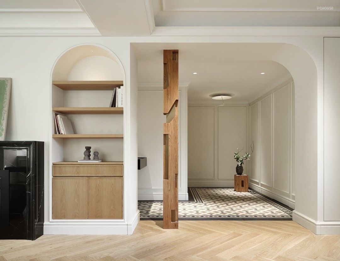 屋主是一对年轻夫妻,设计师定位了现代法式自然的空间氛围。布局规划上,设计师基于满足两人居住的基本需求,通过缩减家政区域的面积,有效释放了多余的空间。原本的保姆间被重新规划为玄关区域。原有的两个入口,则采取了封闭其中一个、将另一个升级为主门的策略,并在新的主门入口处增设了一个充满复古气息的入户玄关,进一步优化了空间布局与整体美感。