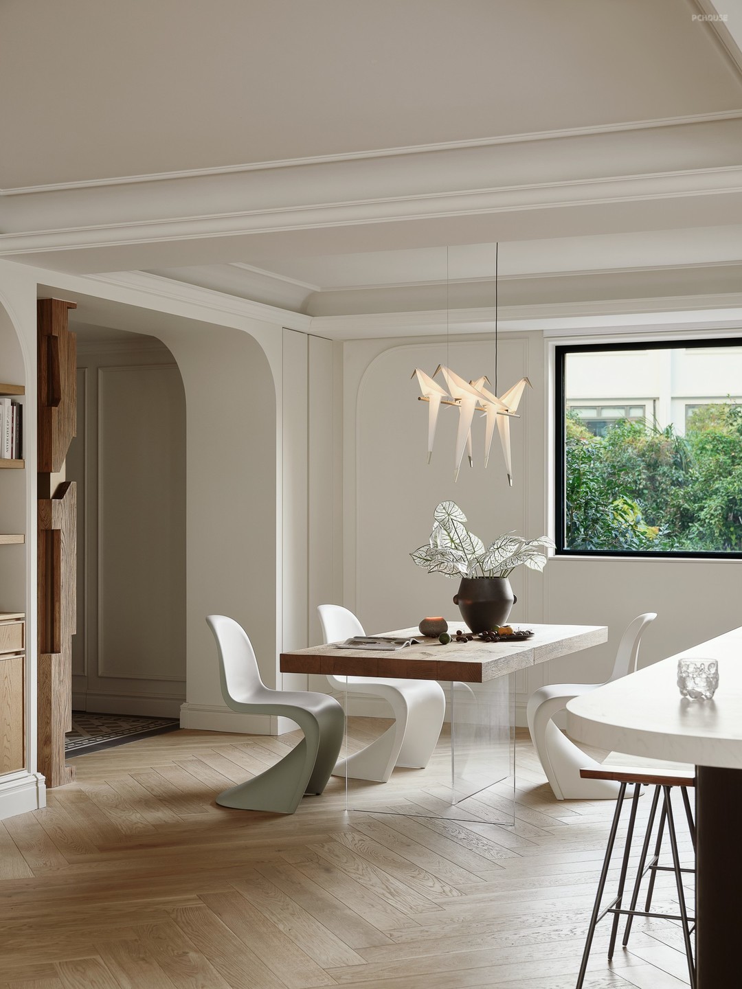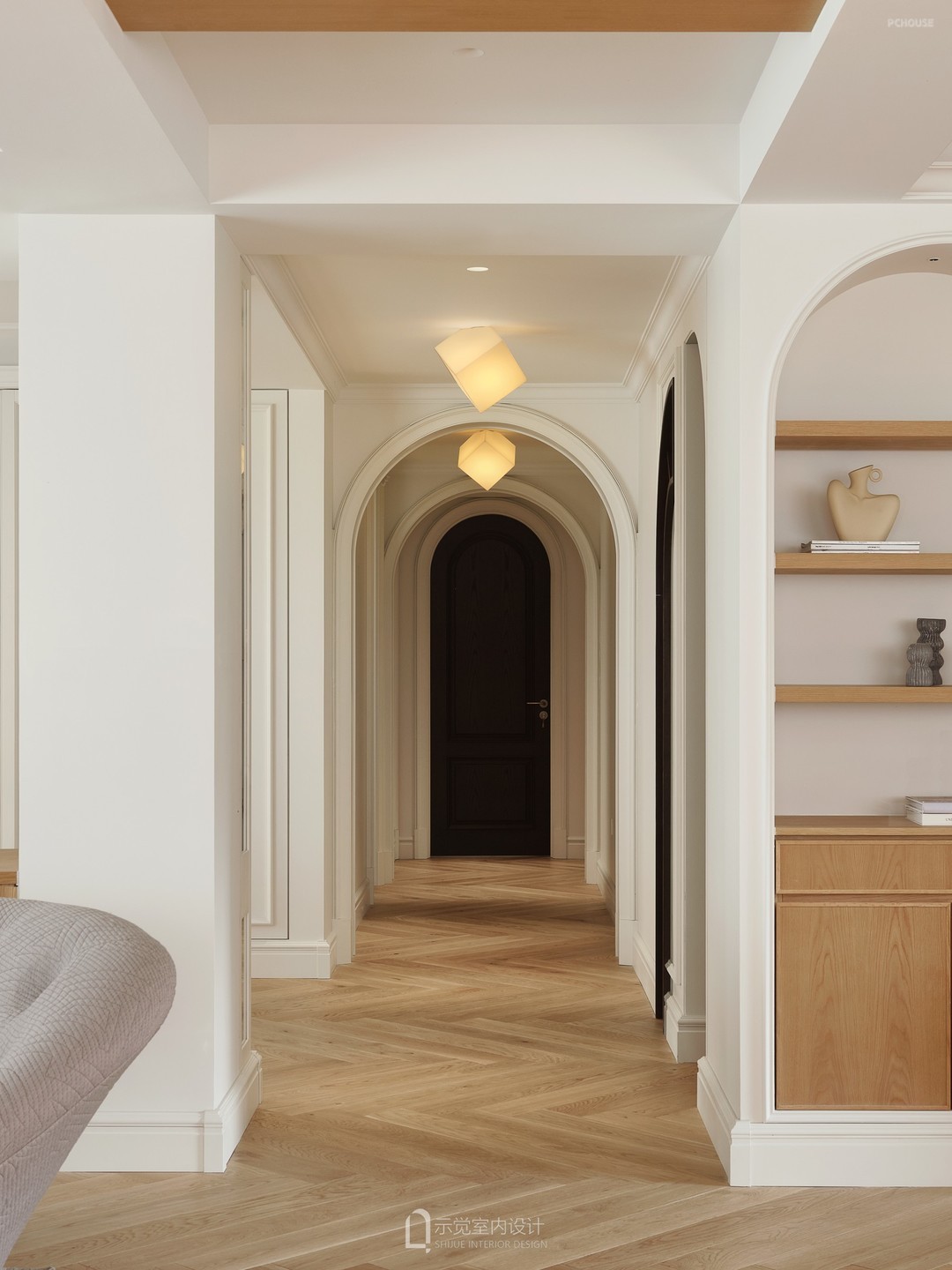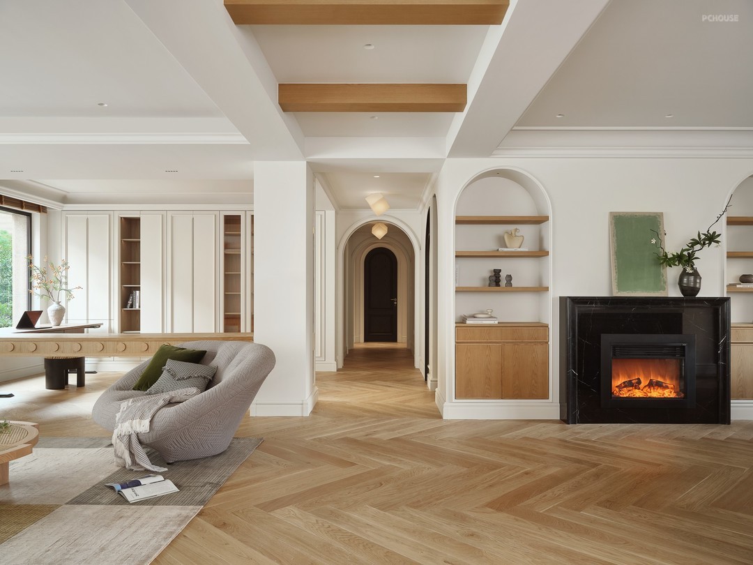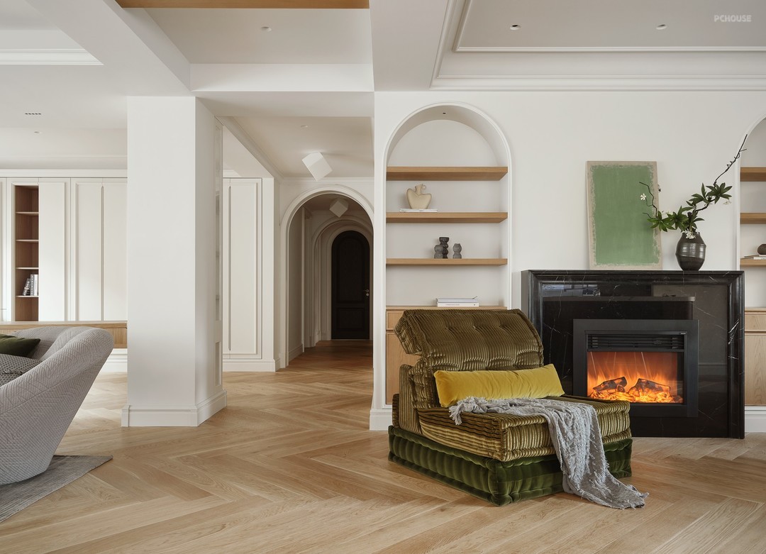 屋主是一对年轻夫妻,设计师定位了现代法式自然的空间氛围。布局规划上,设计师基于满足两人居住的基本需求,通过缩减家政区域的面积,有效释放了多余的空间。原本的保姆间被重新规划为玄关区域。原有的两个入口,则采取了封闭其中一个、将另一个升级为主门的策略,并在新的主门入口处增设了一个充满复古气息的入户玄关,进一步优化了空间布局与整体美感。