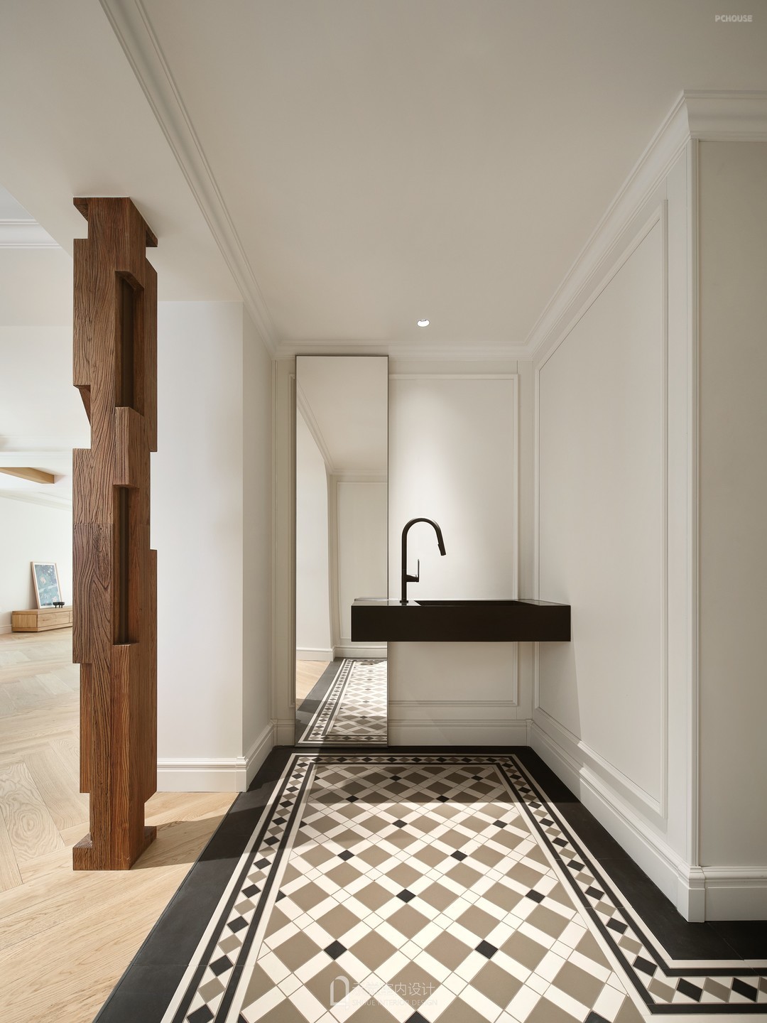 玄关,似乎创造出了一种新的美感。拼花砖宛如一幅浑然天成的艺术画卷,几何纹路在磨砂的质感中流转,映衬出别样风情。