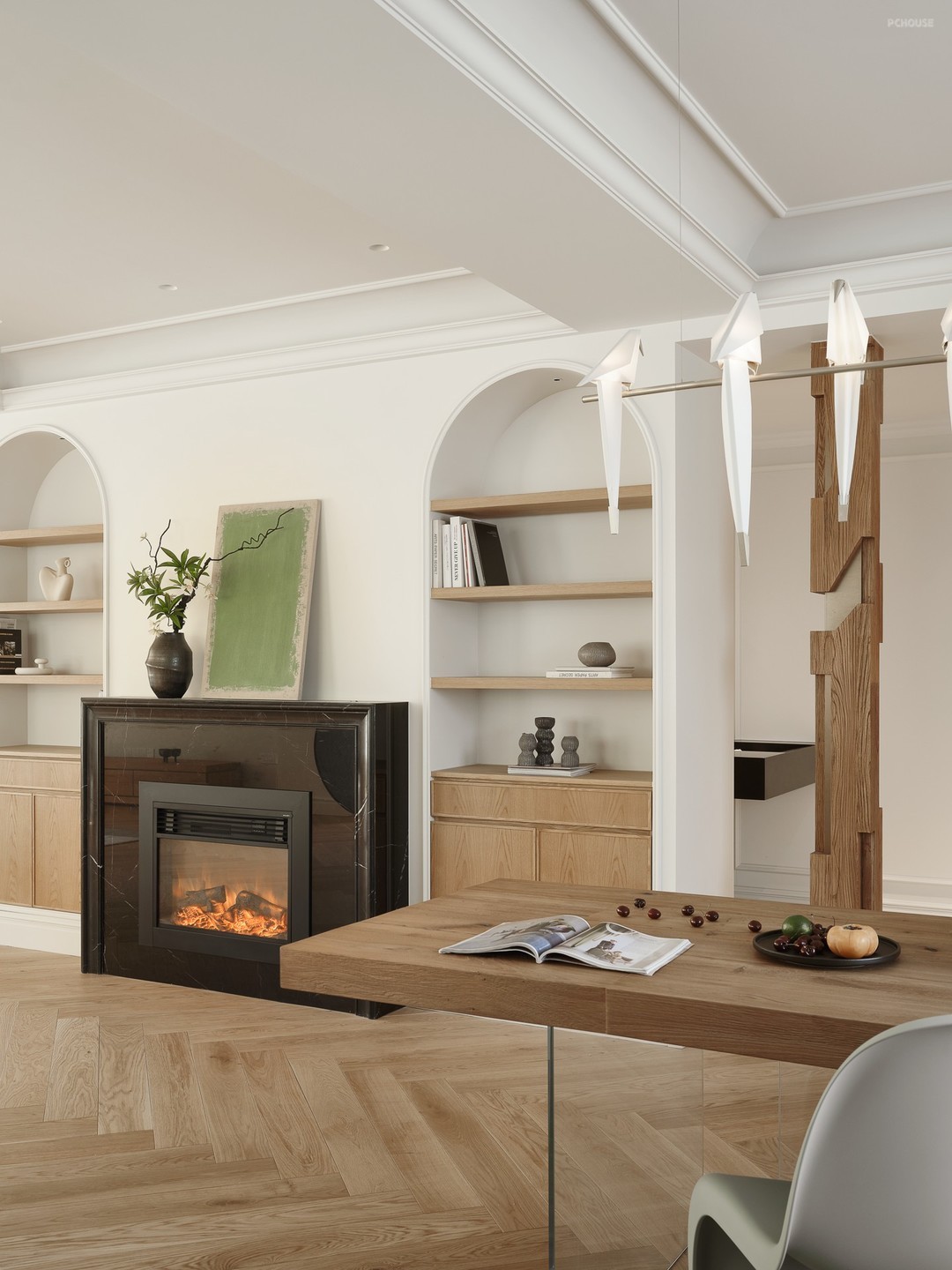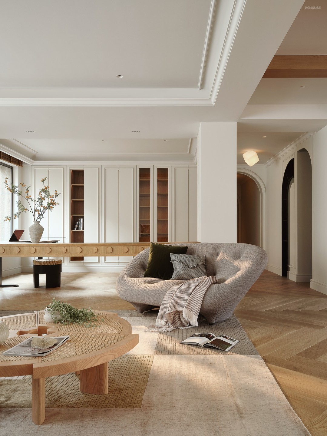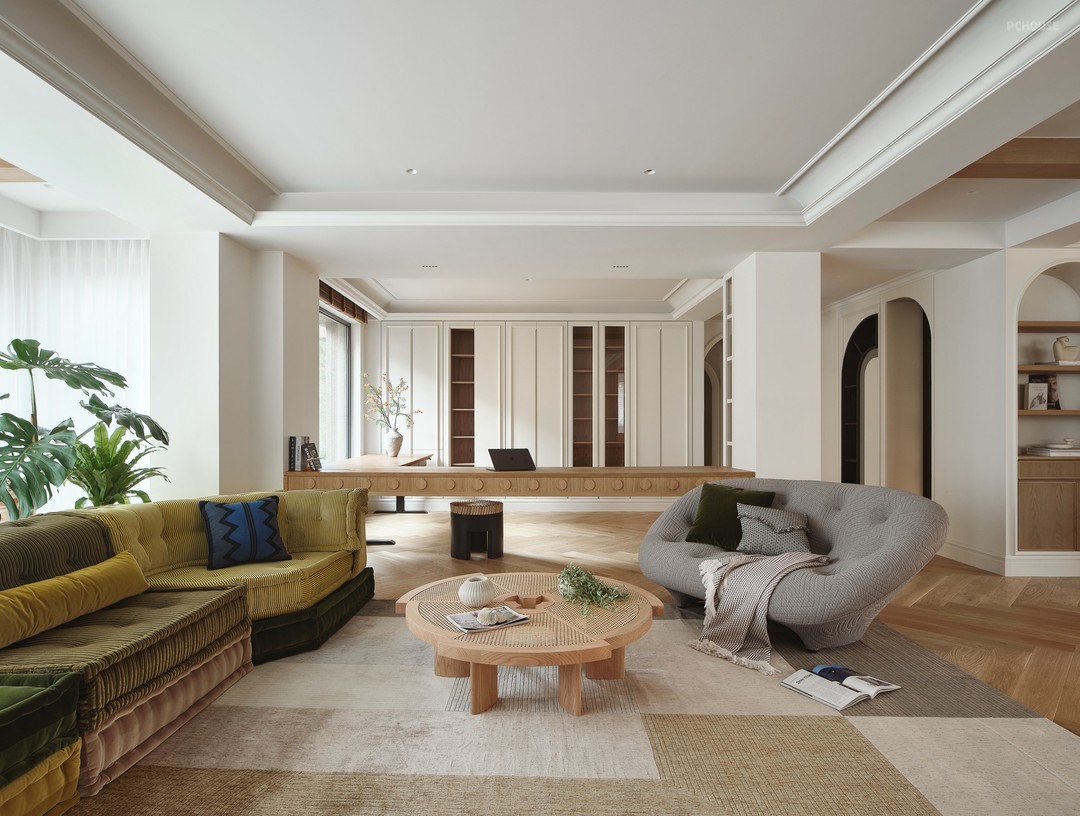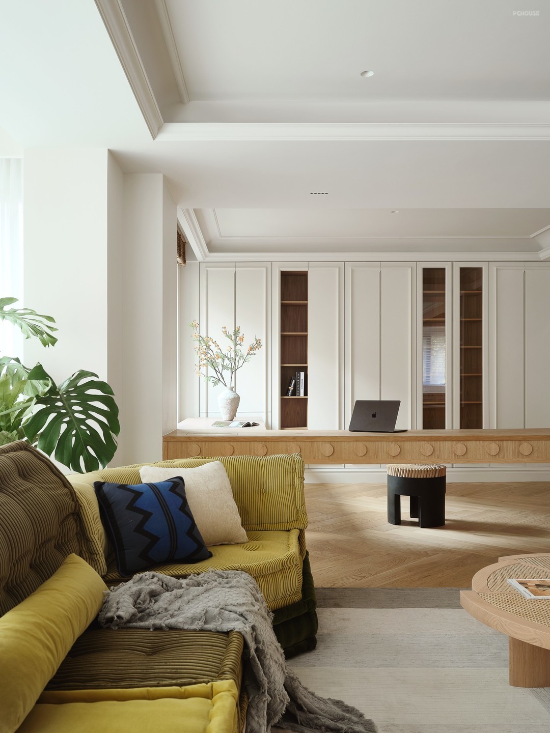 艺术的精髓在于细节的诠释,客厅不仅注重空间布局的合理性,更将自然元素融入每一处细节。悬浮书台的另一方,屋主可一人坐在书房内侧,另一人在客厅外侧,两人可以在此处一起搭乐高,互动交流。